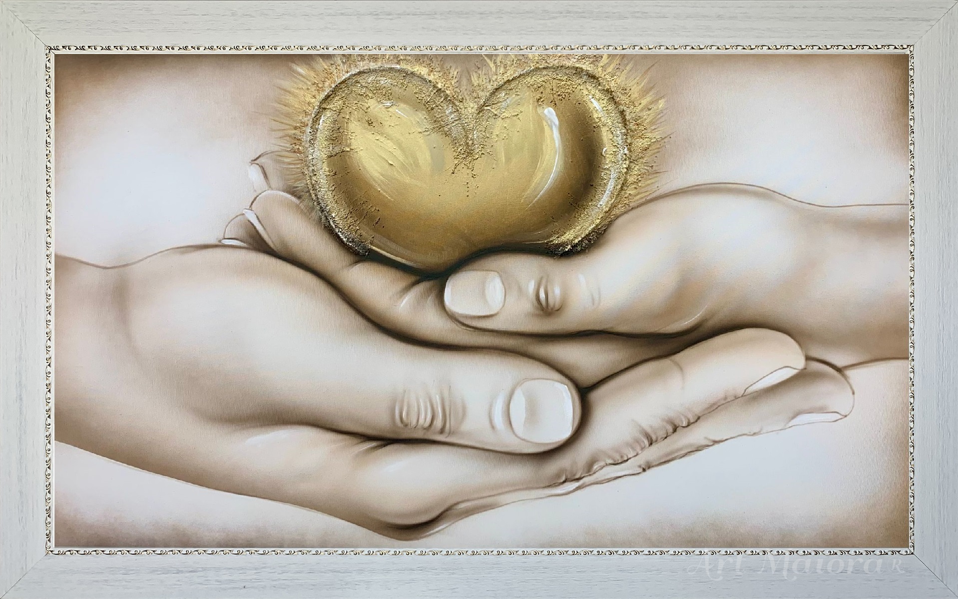 ABBRACCIO DEL CUORE CON DIMENSIONE TELA DI 110 X 65 cm con FINITURA VARIANTE TORTORA CALDO CON DECORI ORO VINTAGE in abbinamento la CORNICE CONTEMPORANEA ORO. dipinto su tela realizzato a mano La dimensione finale del dipinto è 120 X 75 cm (larghezza x altezza)