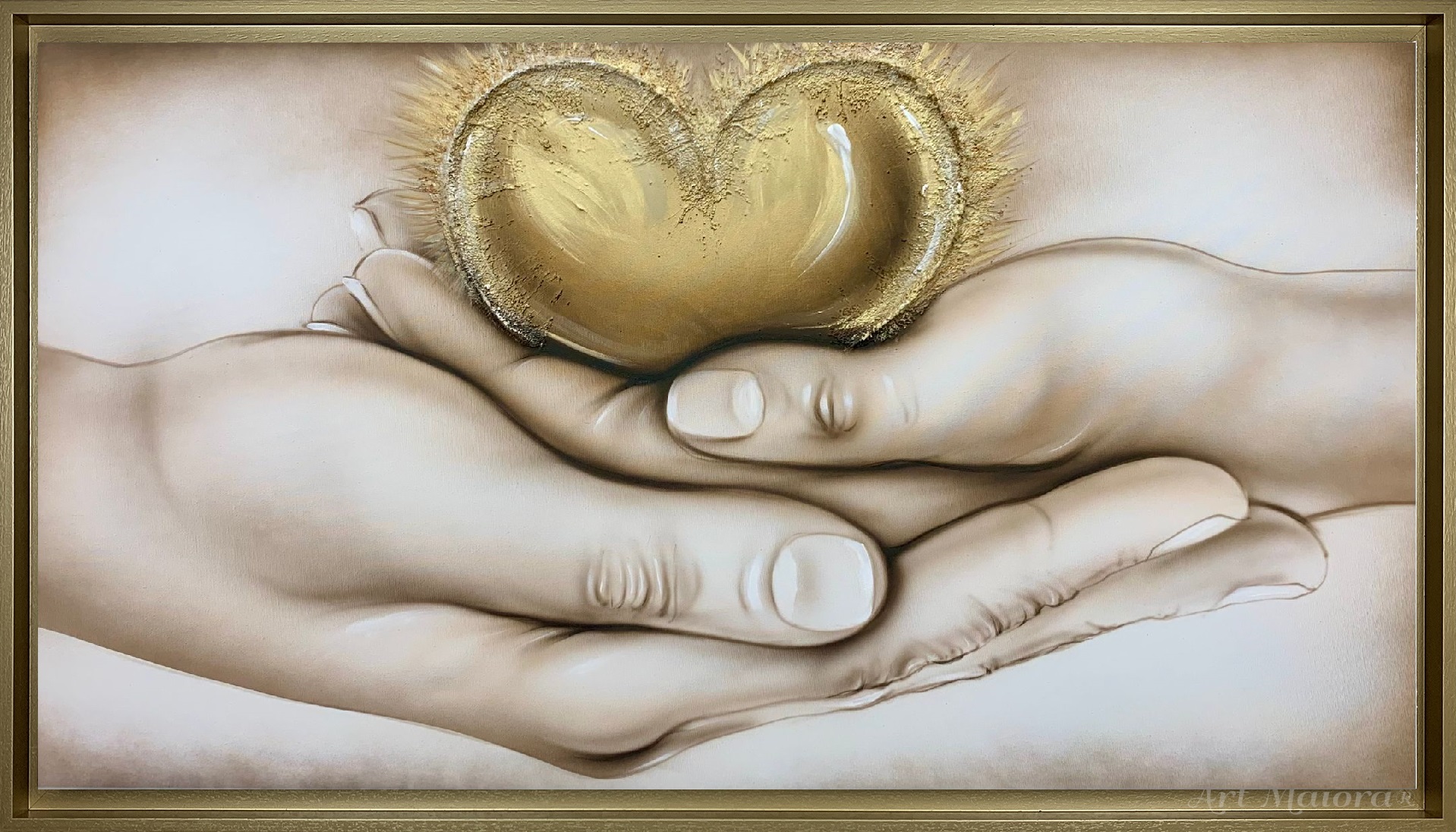 ABBRACCIO DEL CUORE CON DIMENSIONE TELA DI 110 X 65 cm con FINITURA VARIANTE TORTORA CALDO CON DECORI ORO VINTAGE in abbinamento la CORNICE AD L ORO VINTAGE. dipinto su tela realizzato a mano La dimensione finale del dipinto è 120 X 75 cm (larghezza x altezza)