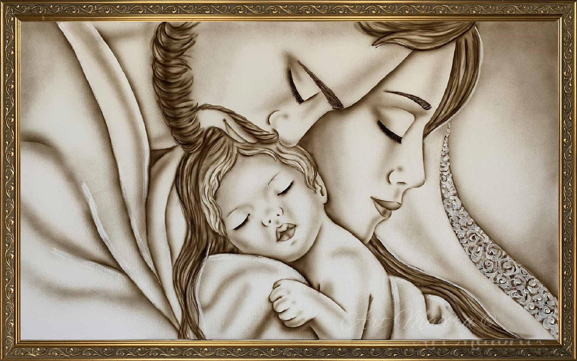 Quadro dipinto a mano “Abbraccio Romantico”, 120x75cm, finitura tortora caldo, cornice decape oro.