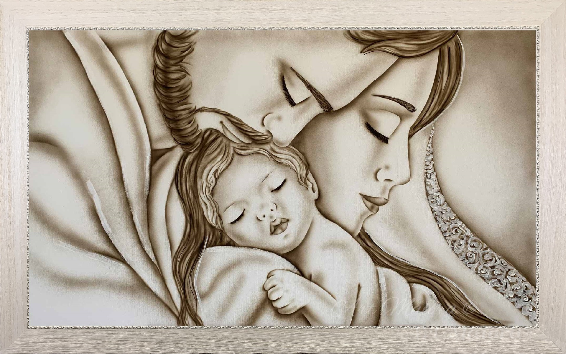 Quadro dipinto a mano “Abbraccio Romantico”, 120x75cm, finitura tortora, cornice contemporanea argento.