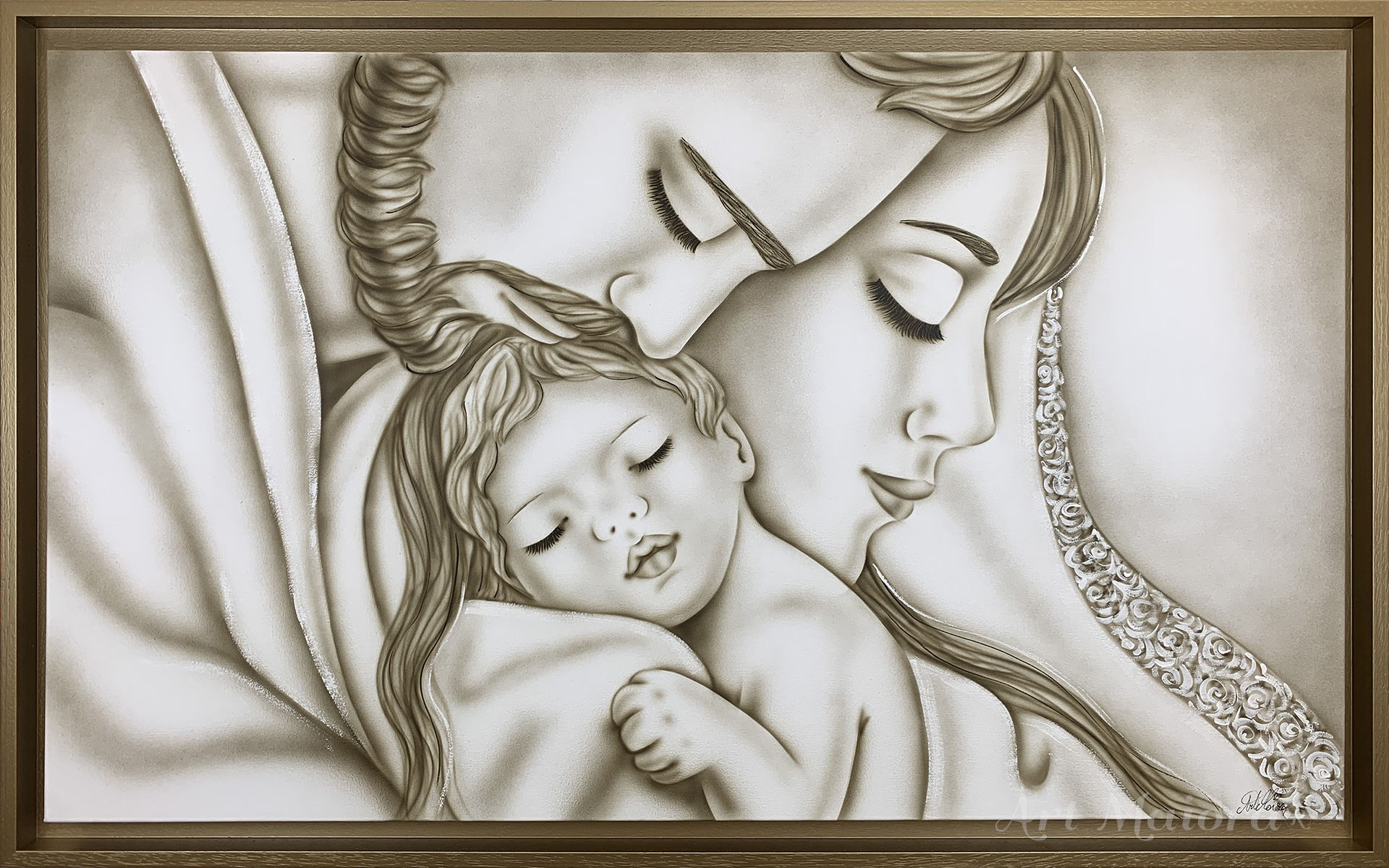 Quadro dipinto a mano “Abbraccio Romantico”, 120x75cm, finitura tortora caldo, cornice ad l oro vintage.