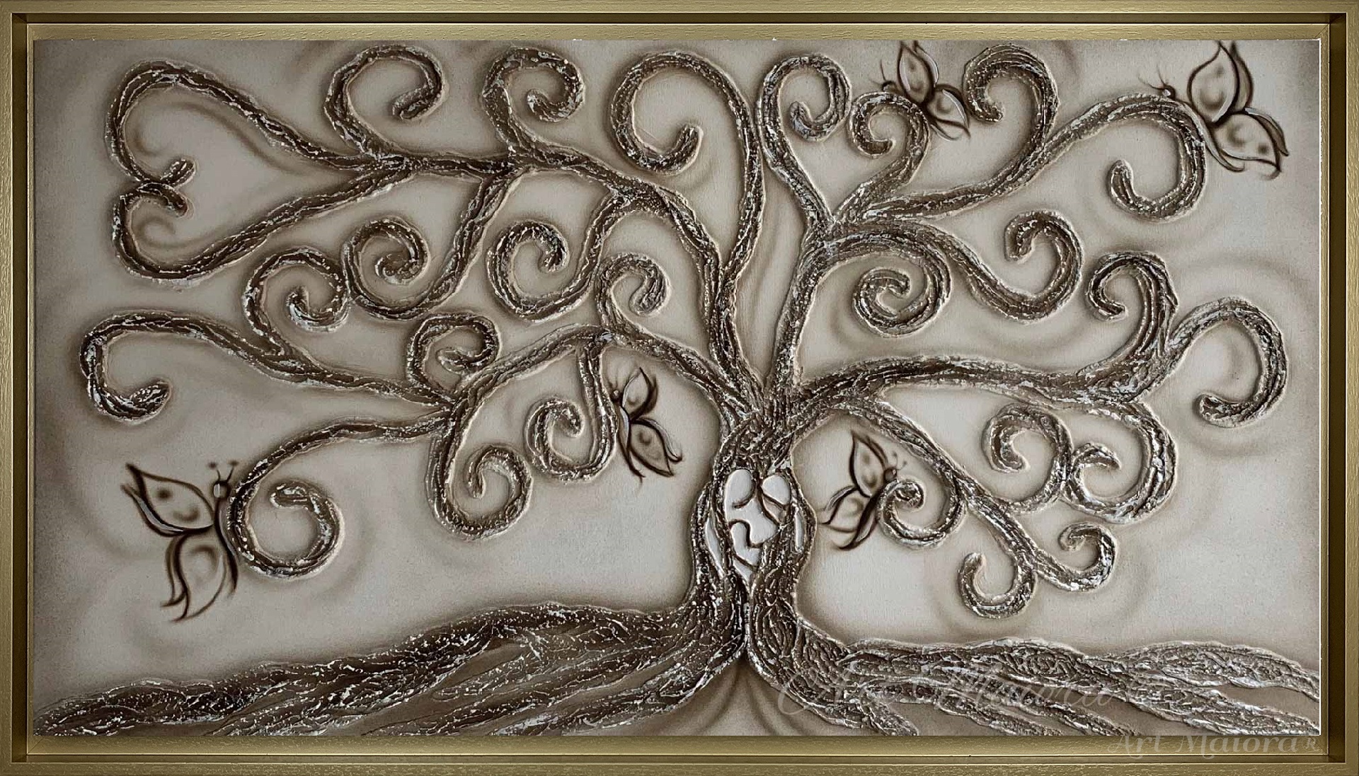 Quadro dipinto a mano “Albero Della Vita”, 140x80cm, finitura nocciola, cornice ad l oro vintage.