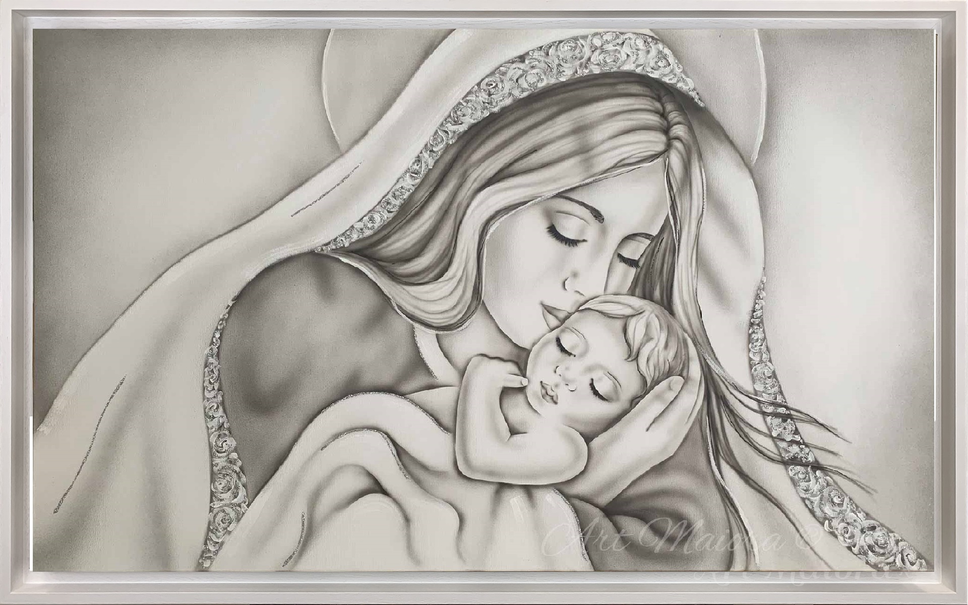 AMORE DI MAMMA CON DIMENSIONE TELA DI 110 X 65 cm con FINITURA VARIANTE TORTORA CALDO in abbinamento la CORNICE AD L BIANCA PORO APERTO. dipinto su tela realizzato a mano La dimensione finale del dipinto è 120 X 75 cm (larghezza x altezza) e APPLICAZIONE GLITTER SILVER
