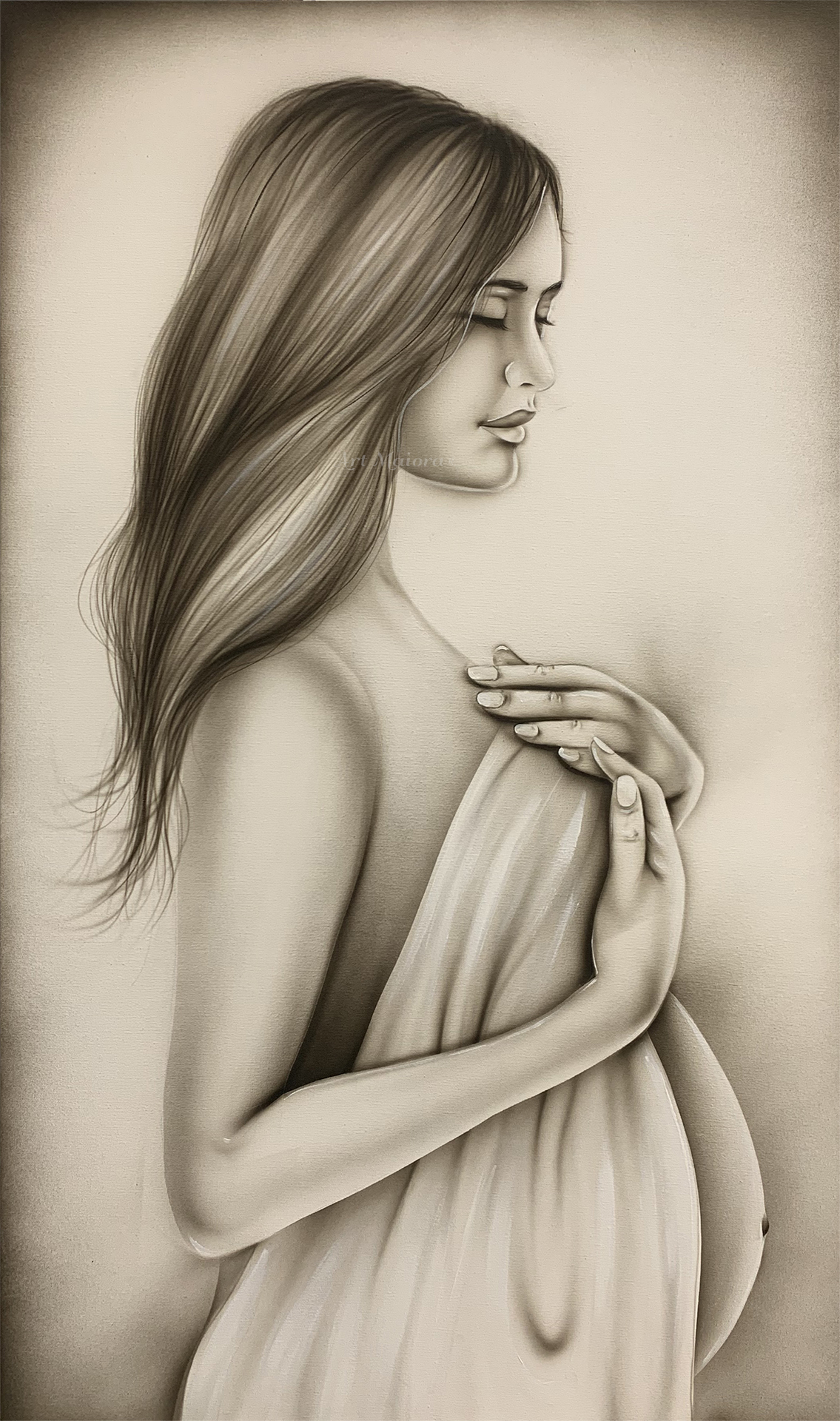Quadro dipinto a mano “Attesa Maternità”, 110x65cm, finitura tortora, senza cornice.
