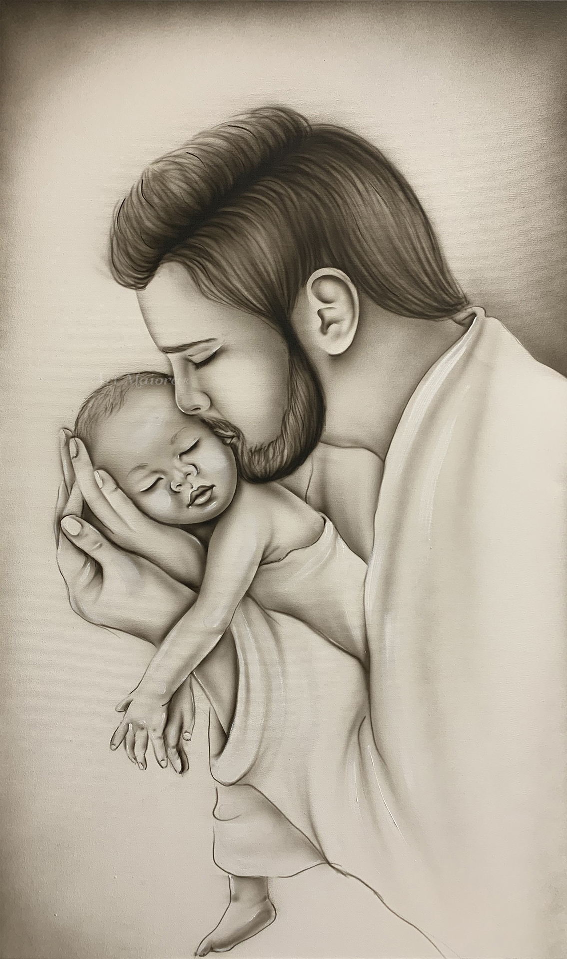 Quadro dipinto a mano “Attesa Paternitaà”, 110x65cm, finitura tortora, senza cornice.