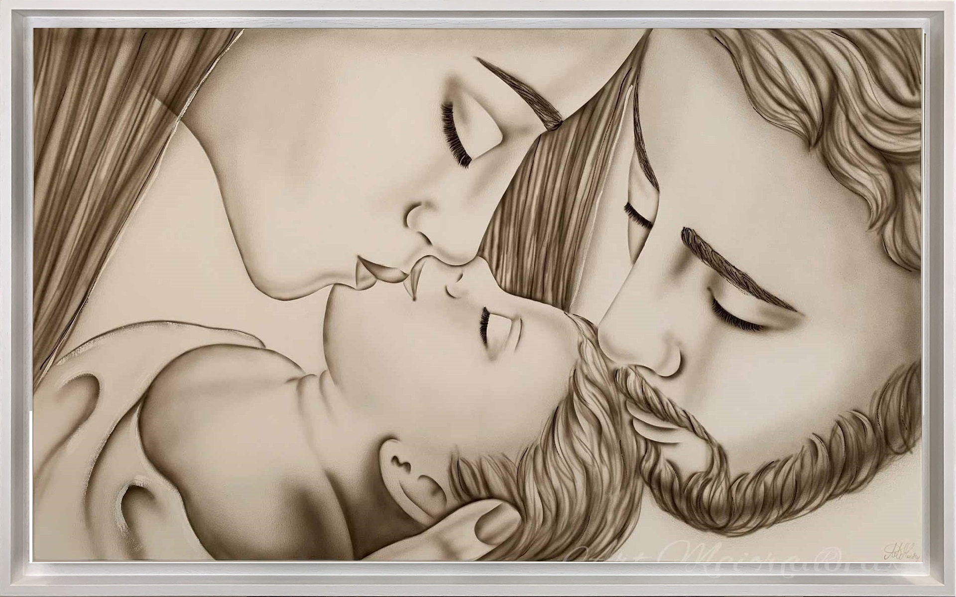 Quadro dipinto a mano “Bacio”, 120x75cm, finitura tortora, cornice ad l bianca poro aperto.