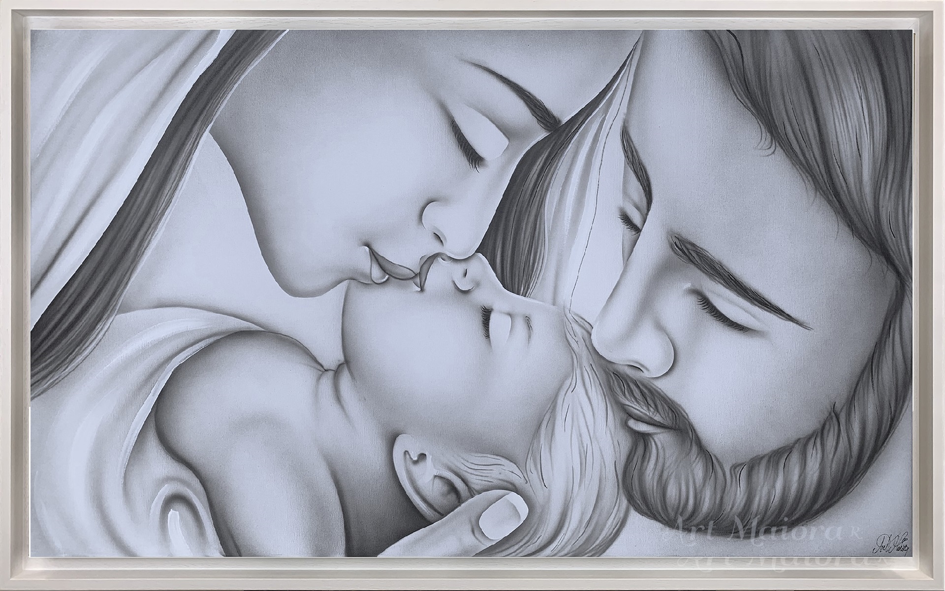 BACIO CON VELO CON DIMENSIONE TELA DI 110 X 65 cm con FINITURA VARIANTE GRIGIO in abbinamento la CORNICE AD L BIANCA PORO APERTO. dipinto su tela realizzato a mano La dimensione finale del dipinto è 120 X 75 cm (larghezza x altezza)