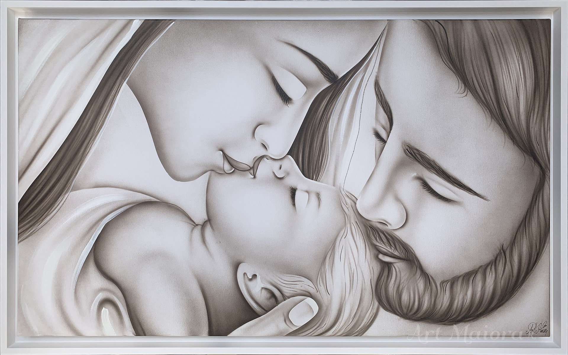 Quadro dipinto a mano “Bacio”, 120x75cm, finitura tortora, cornice ad l bianca poro aperto.