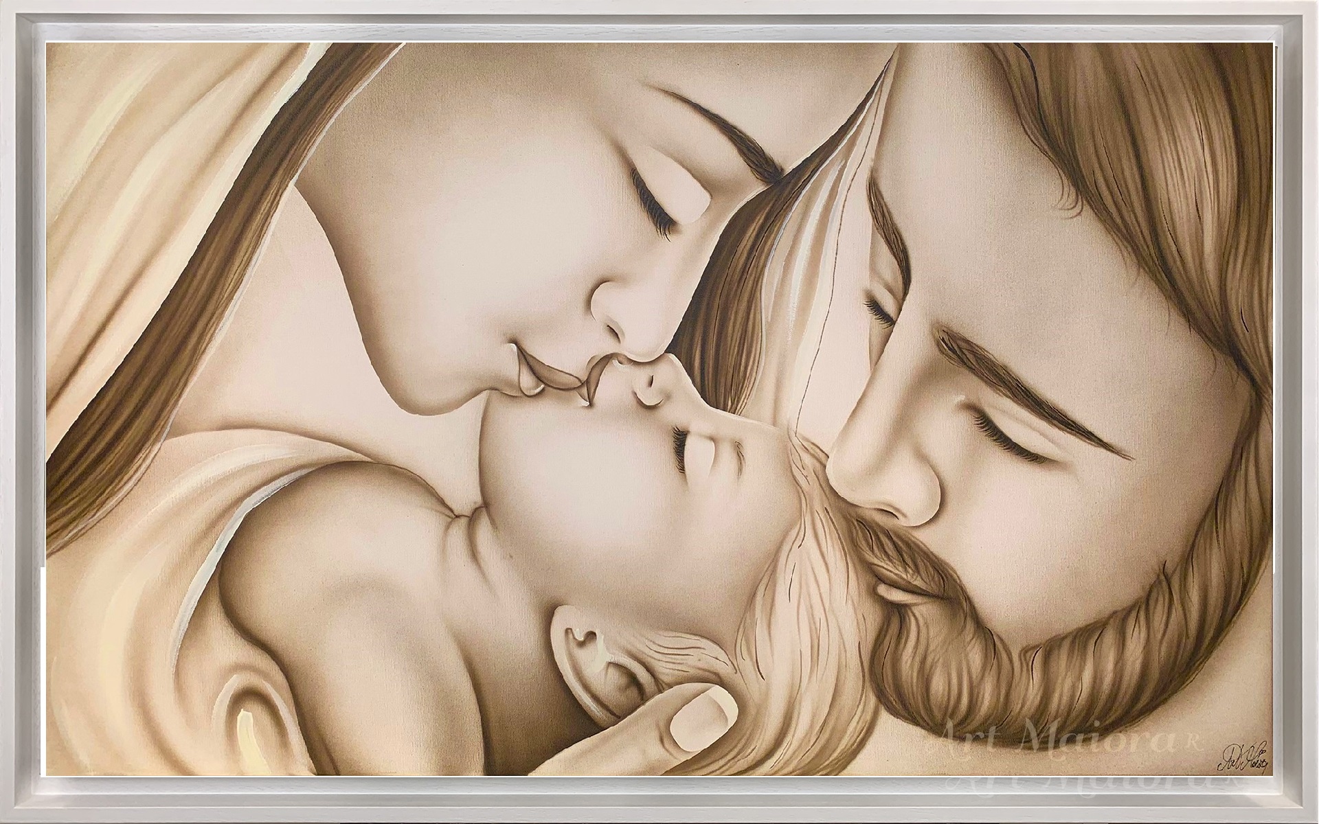 BACIO CON VELO CON DIMENSIONE TELA DI 110 X 65 cm con FINITURA VARIANTE TORTORA CALDO in abbinamento la CORNICE AD L BIANCA PORO APERTO. dipinto su tela realizzato a mano La dimensione finale del dipinto è 120 X 75 cm (larghezza x altezza)