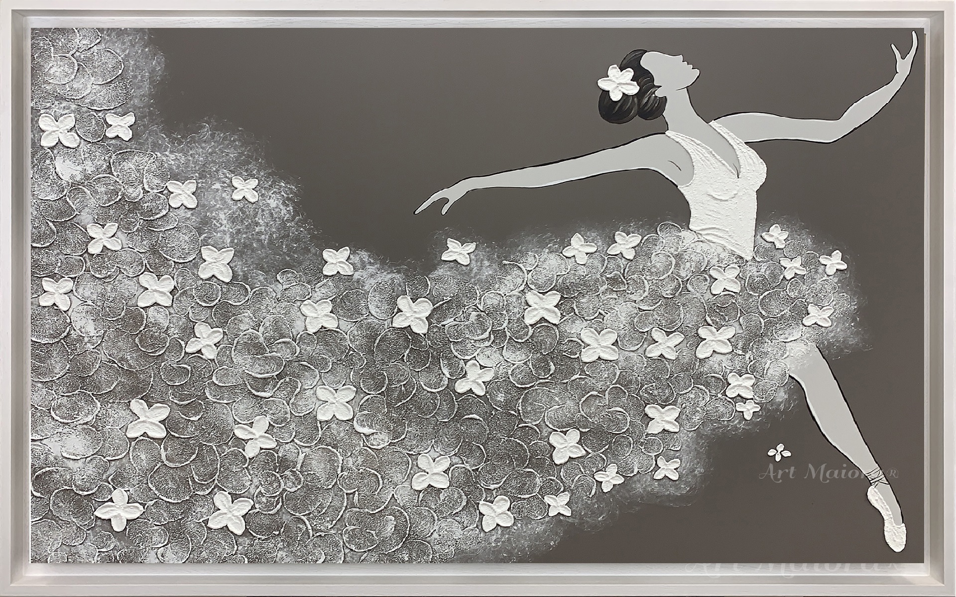 Quadro dipinto a mano “Ballerina”, 130x90cm, finitura tortora grigio, cornice ad l bianca poro aperto.