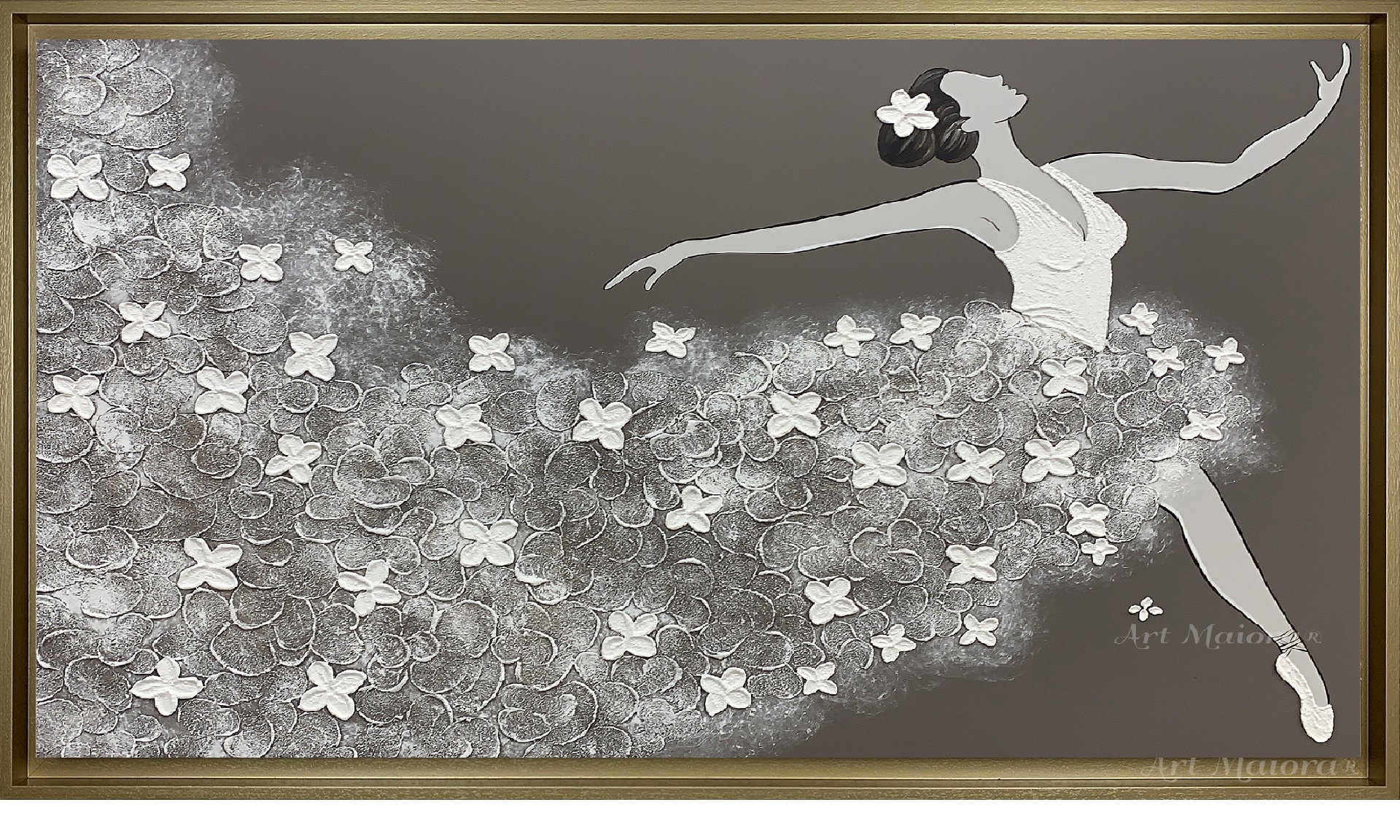 Quadro dipinto a mano “Ballerina”, 160x90cm, finitura tortora grigio, cornice ad l oro vintage.