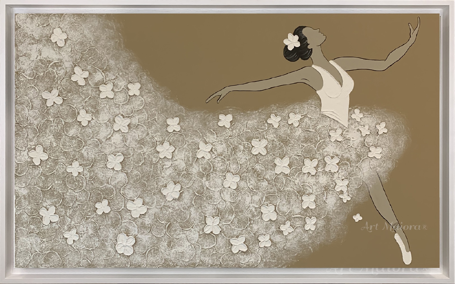 Quadro dipinto a mano “Ballerina”, 160x90cm, finitura tortora caldo, cornice ad l bianca poro aperto.