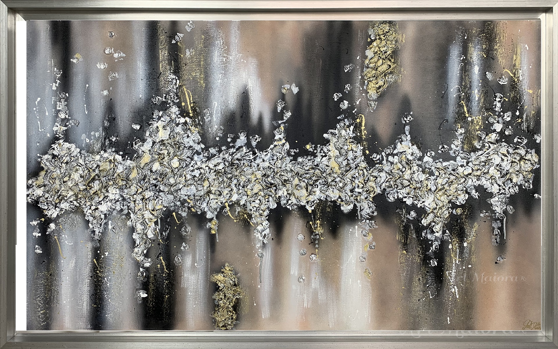 Quadro dipinto a mano “Battito”, 130x90cm, finitura oro e argento, cornice ad l in argento.