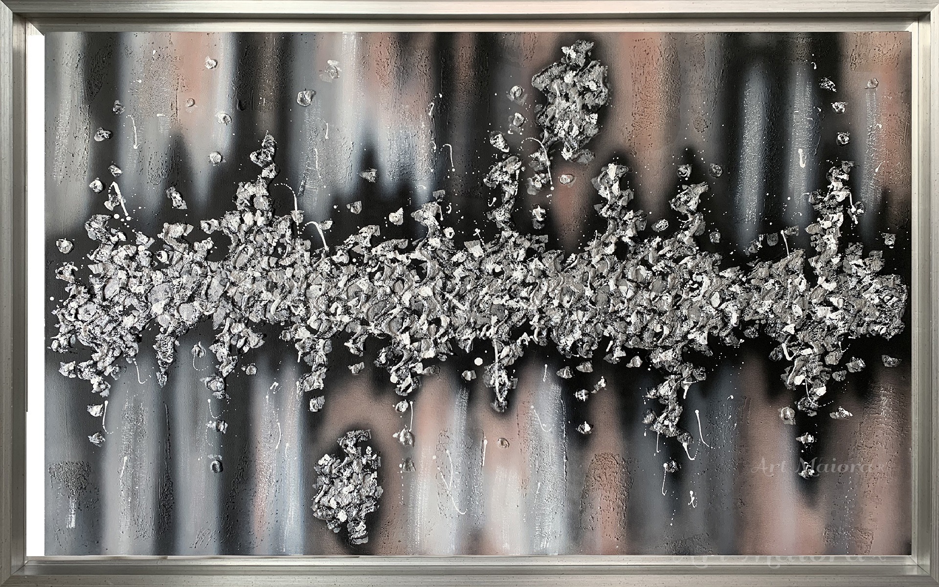 Quadro dipinto a mano “Battito”, 160x90cm, finitura silver, cornice ad l in argento.