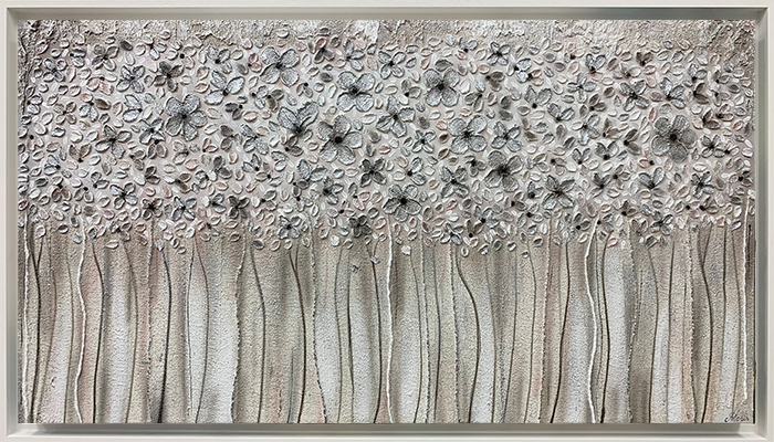 Quadro dipinto a mano “Bouquet”, 110x110cm, finitura silver, cornice ad l bianca a poro aperto.
