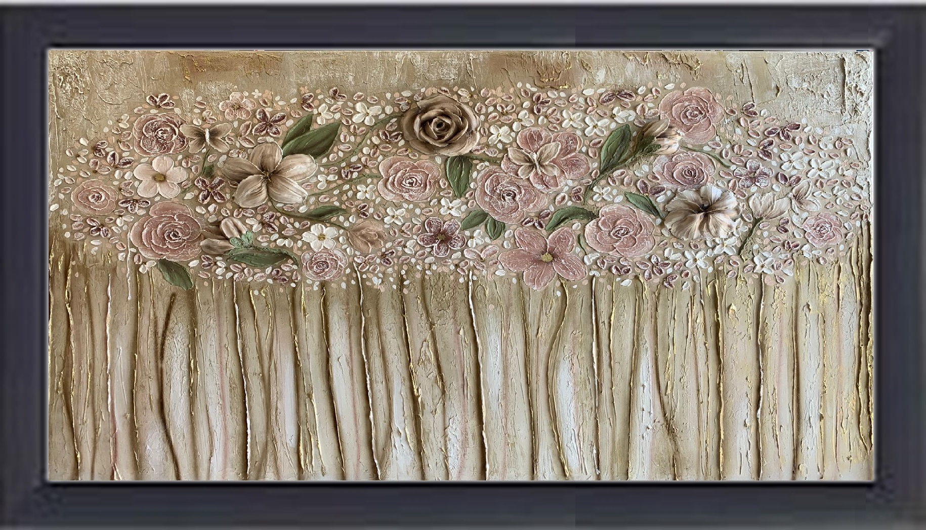 COLORE IN FIORE CON DIMENSIONE TELA DI 130 X 70 cm con FINITURA VARIANTE TRADIZIONALE in abbinamento la CORNICE AD L NERA OPACA. dipinto su tela realizzato a mano La dimensione finale del dipinto è 140 X 80 cm (larghezza x altezza)