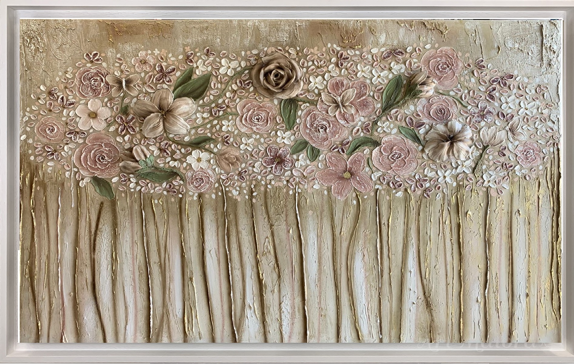 COLORE IN FIORE CON DIMENSIONE TELA DI 150 X 80 cm con FINITURA VARIANTE TRADIZIONALE in abbinamento la CORNICE AD L BIANCA PORO APERTO. dipinto su tela realizzato a mano La dimensione finale del dipinto è 160 X 90 cm (larghezza x altezza)