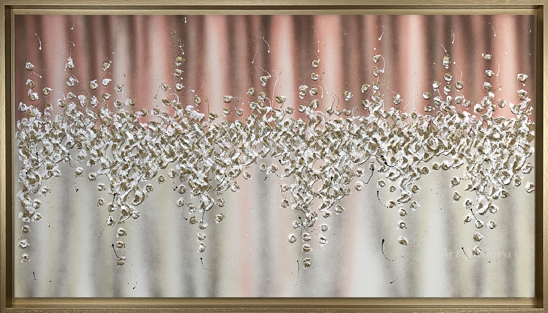 Quadro dipinto a mano “Comete”, 140x80cm, finitura pink, cornice ad l oro vintage.