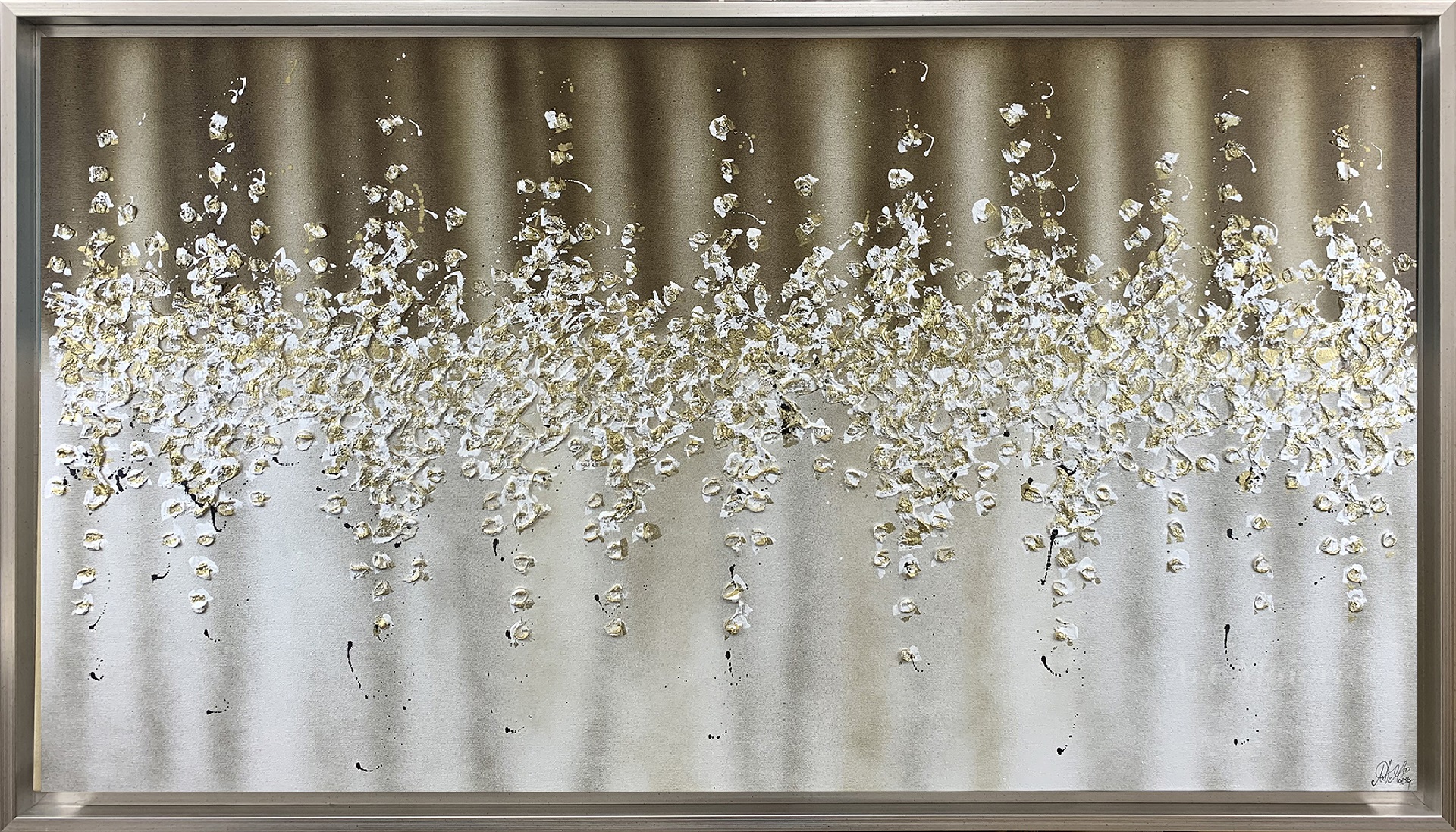 Quadro dipinto a mano “Comete”, 140x80cm, finitura bianco e nero, cornice ad l in argento.