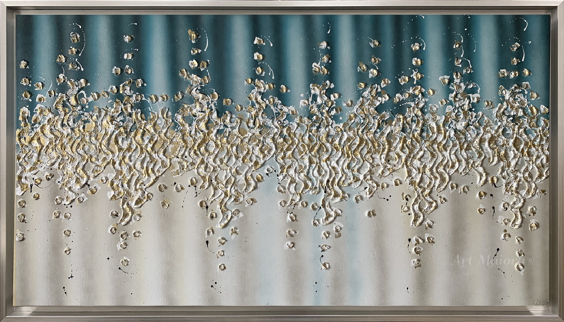 Quadro dipinto a mano “Comete”, 140x80cm, finitura ottanio e oro, cornice ad l in argento.