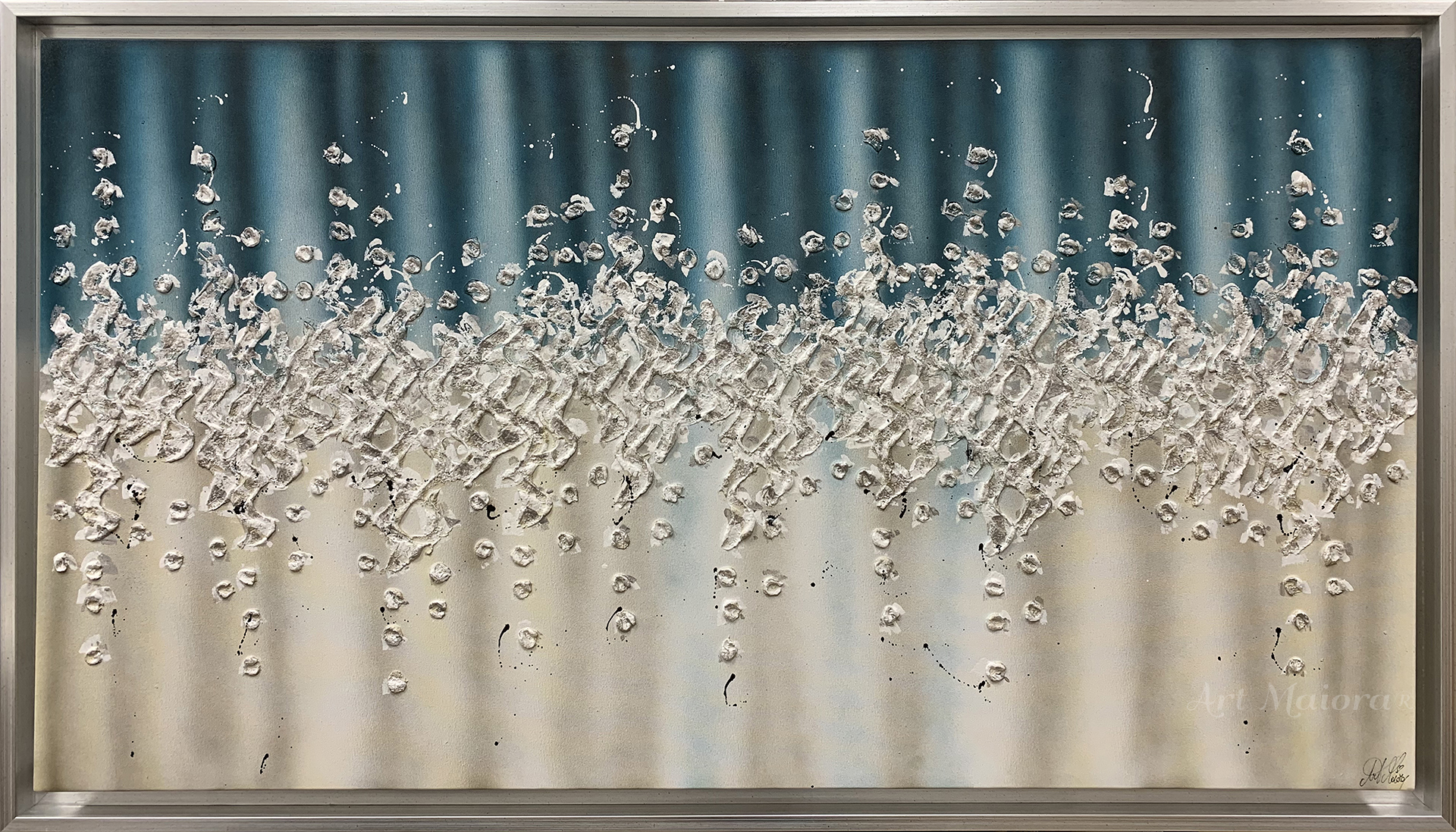 Quadro dipinto a mano “Comete”, 140x80cm, finitura ottanio e argento, cornice ad l in argento.