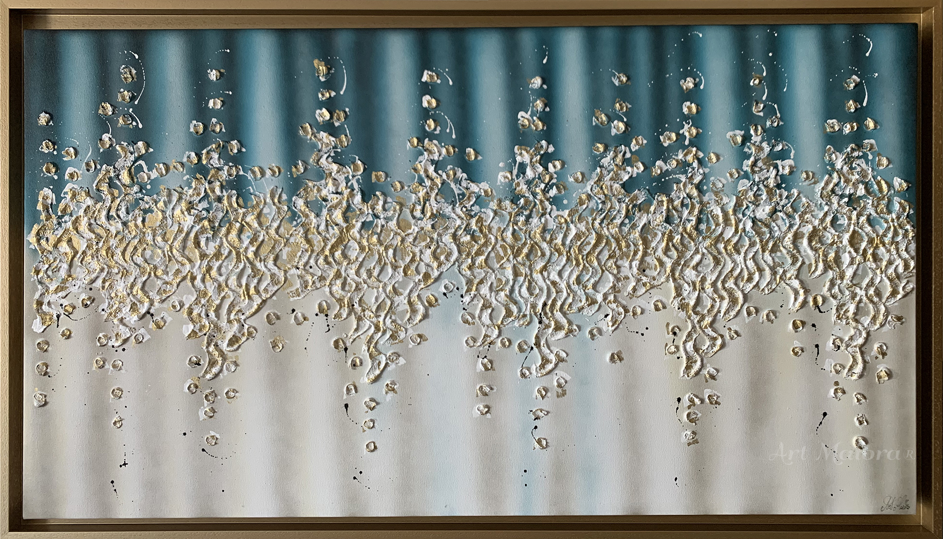 Quadro dipinto a mano “Comete”, 160x110cm, finitura ottanio e oro, cornice ad l oro vintage.