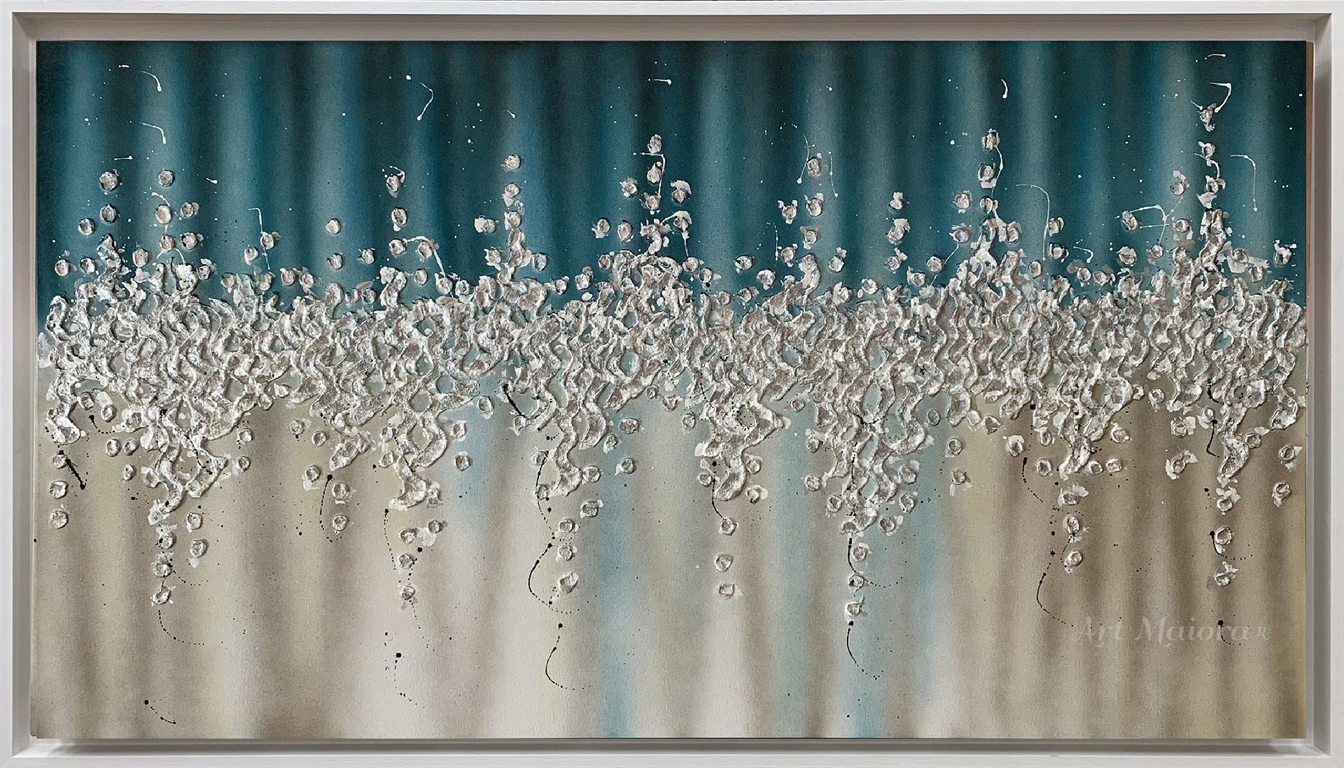 Quadro dipinto a mano “Comete”, 160x90cm, finitura ottanio e argento, cornice ad l bianca poro aperto.