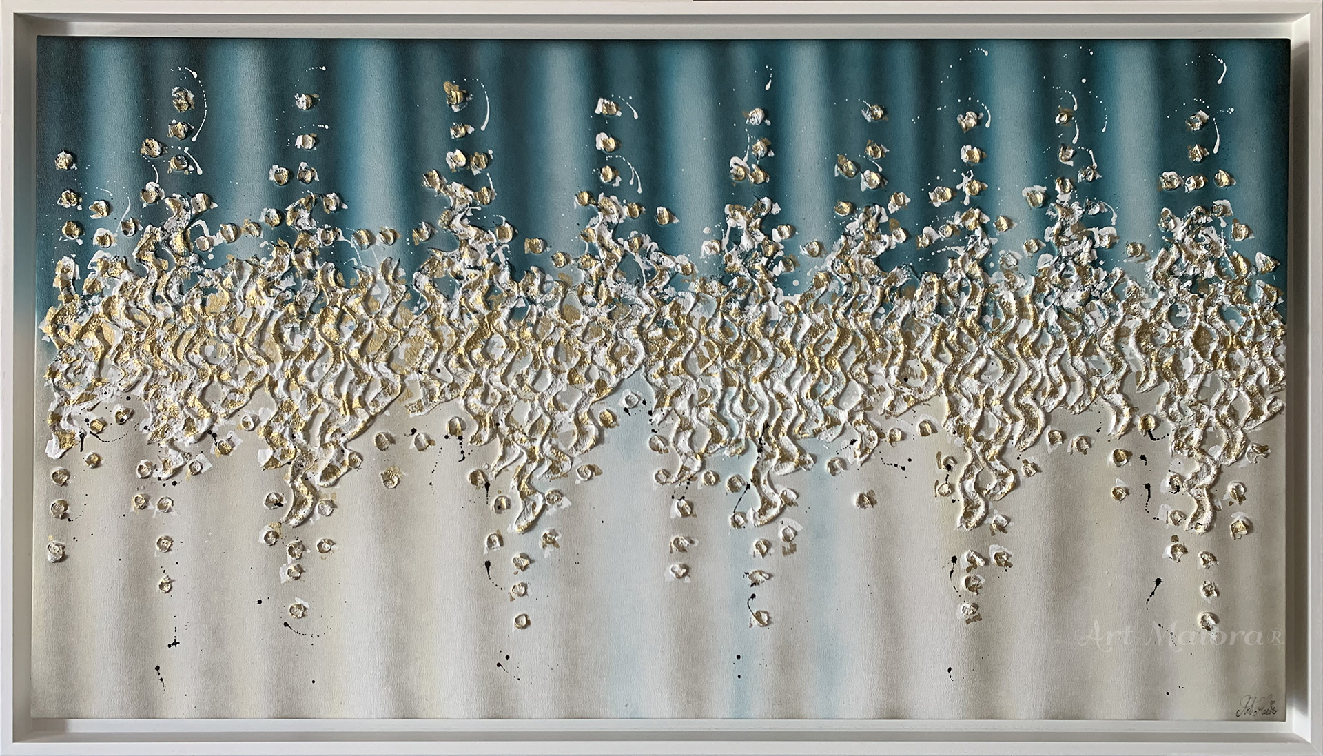 Quadro dipinto a mano “Comete”, 160x90cm, finitura ottanio e oro, cornice ad l bianca poro aperto.