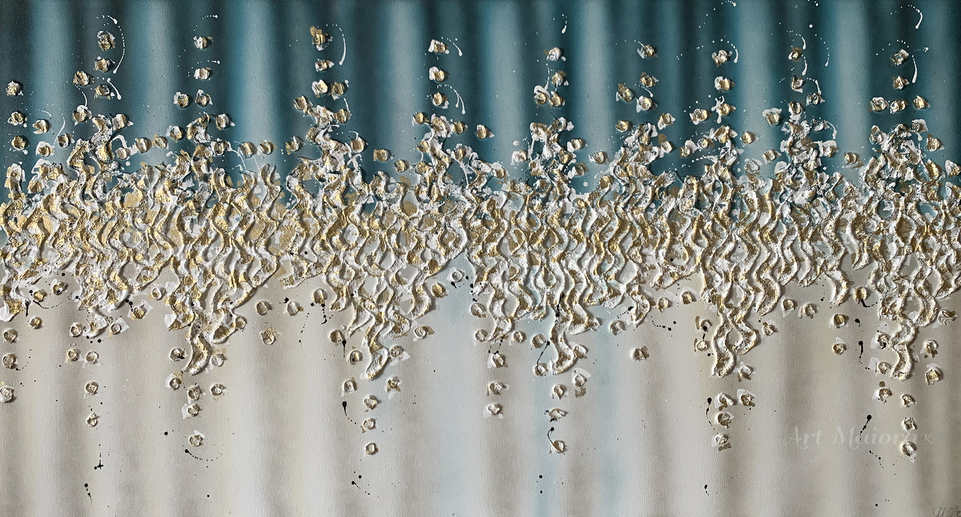 Quadro dipinto a mano “Comete”, 150x80cm, finitura ottanio e oro, senza cornice.