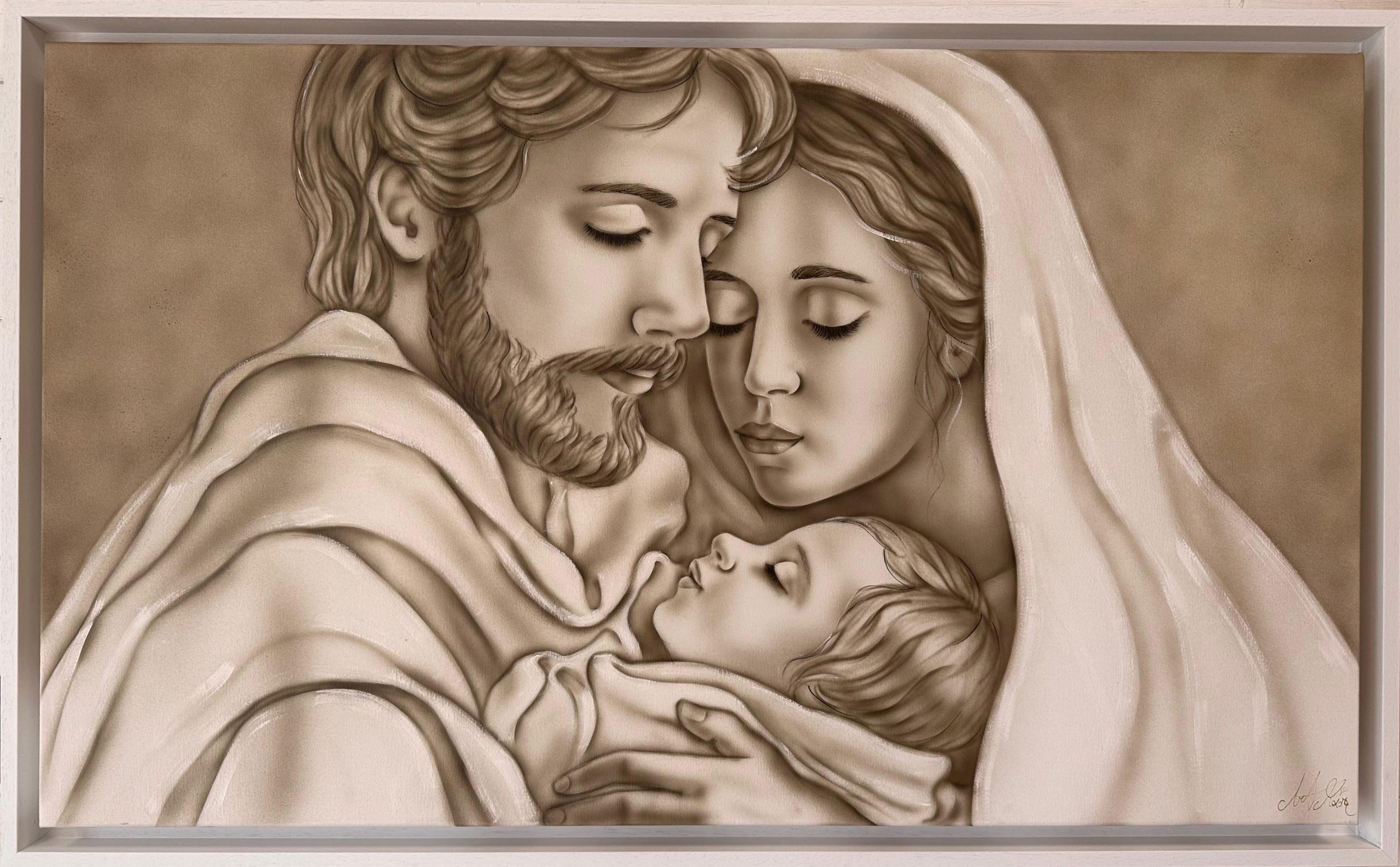 CUSTODI DELL AMORE CON DIMENSIONE TELA DI 110 X 65 cm con FINITURA VARIANTE TORTORA CALDO in abbinamento la CORNICE AD L BIANCA PORO APERTO. dipinto su tela realizzato a mano La dimensione finale del dipinto è 120 X 75 cm (larghezza x altezza)