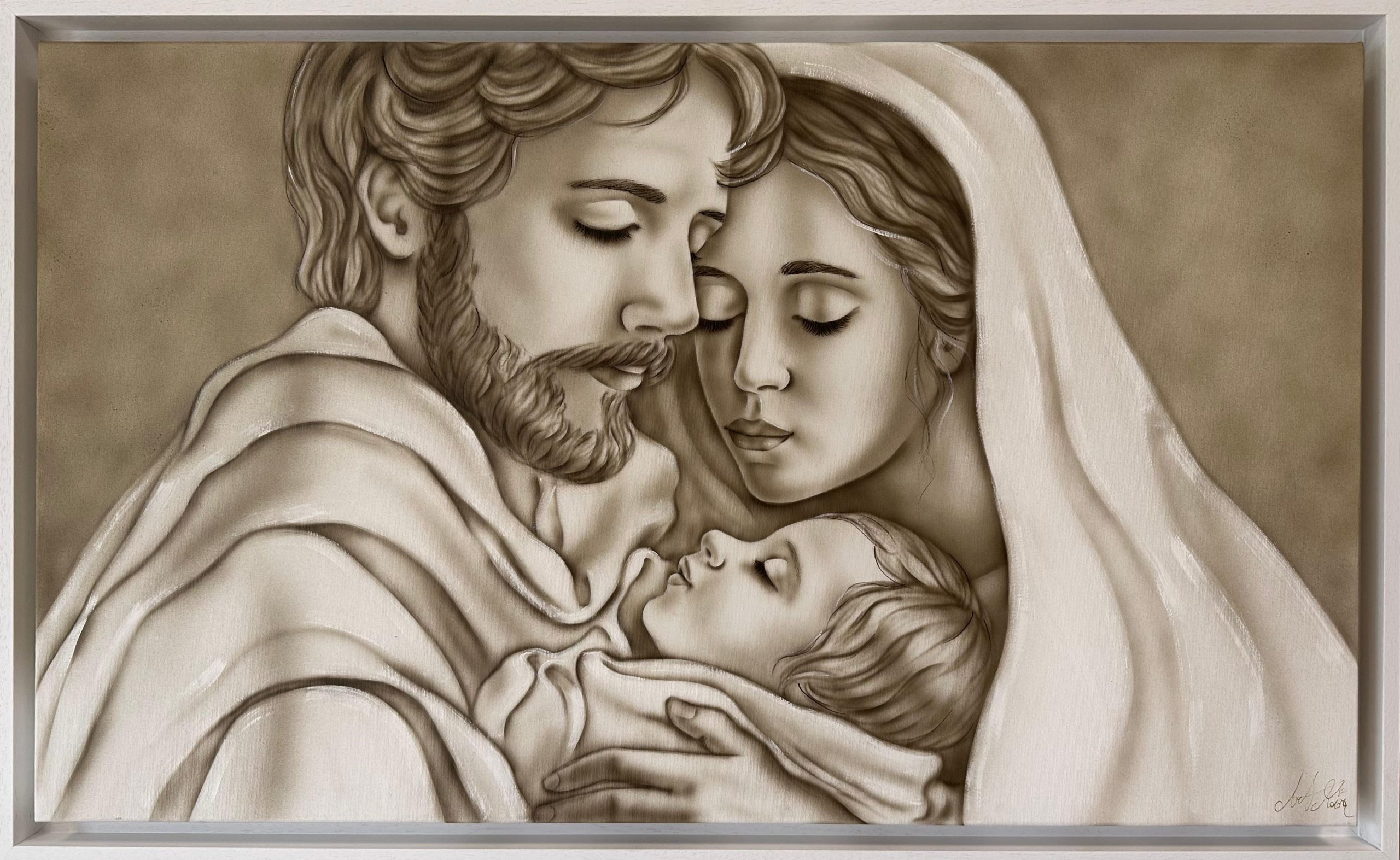 CUSTODI DELL AMORE CON DIMENSIONE TELA DI 110 X 65 cm con FINITURA VARIANTE TORTORA in abbinamento la CORNICE AD L BIANCA PORO APERTO. dipinto su tela realizzato a mano La dimensione finale del dipinto è 120 X 75 cm (larghezza x altezza)