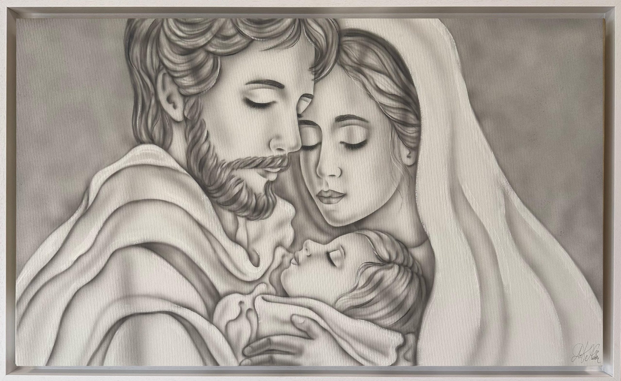CUSTODI DELL AMORE CON DIMENSIONE TELA DI 110 X 65 cm con FINITURA VARIANTE GRIGIO in abbinamento la CORNICE AD L BIANCA PORO APERTO. dipinto su tela realizzato a mano La dimensione finale del dipinto è 120 X 75 cm (larghezza x altezza)