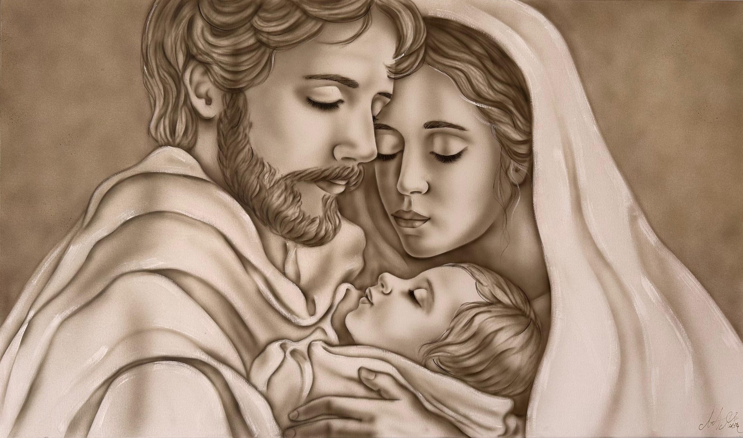 CUSTODI DELL AMORE CON DIMENSIONE TELA DI 110 X 65 cm con FINITURA VARIANTE TORTORA CALDO Senza Cornice. dipinto su tela realizzato a mano