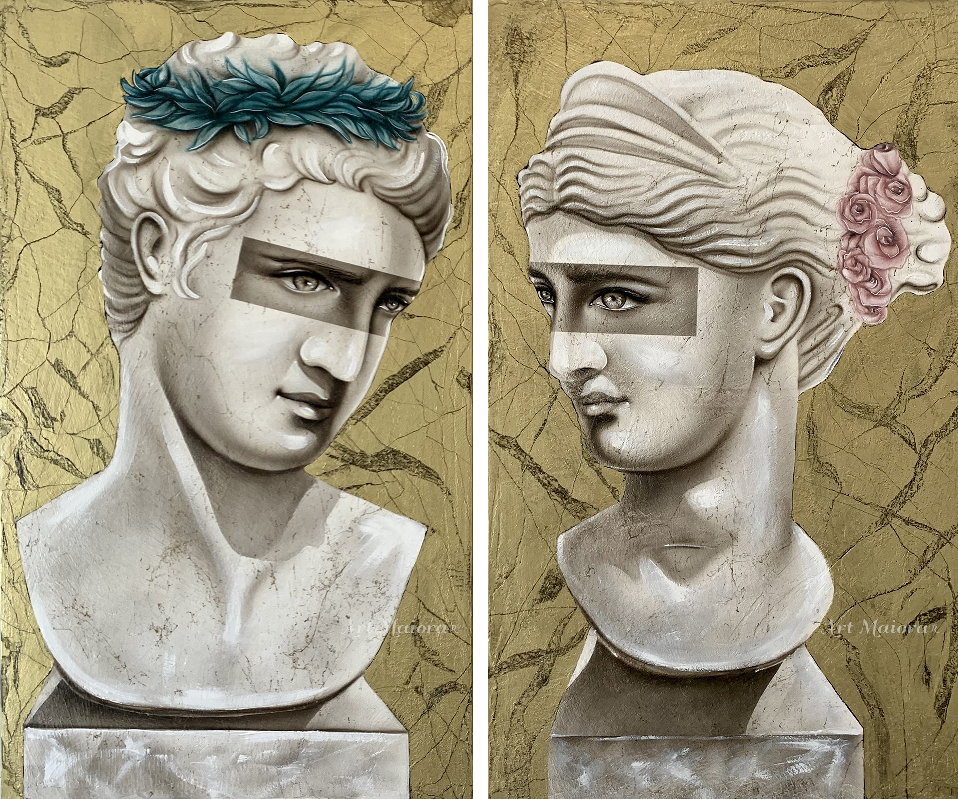 ETERNITY CON DIMENSIONE TELA (2 PEZZI) DI 110 X 65 cad. dipinto su tela realizzato a mano cm con FINITURA VARIANTE GOLD EFFETTO MARMO CON DECORI COLORATI SGUARDO CON FASCIA Senza Cornice