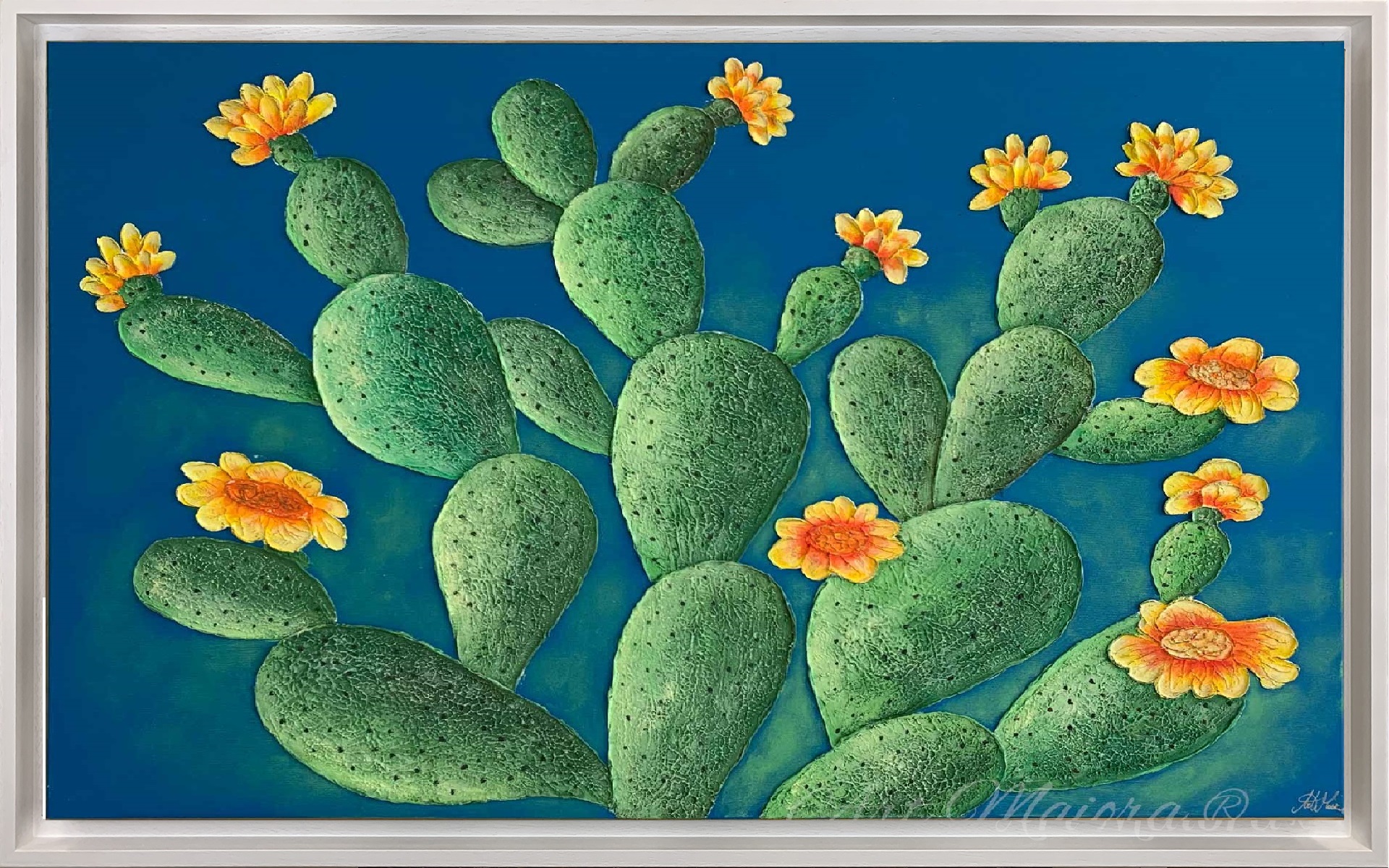 Quadro dipinto a mano “Ficudinnia”, 130x90cm, finitura giallo, cornice ad l bianca poro aperto.