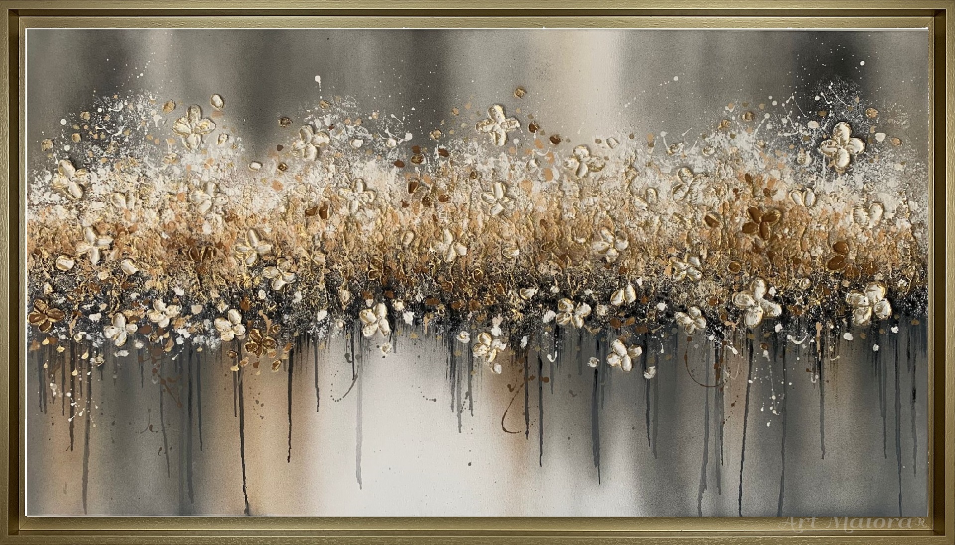 Quadro dipinto a mano “Fiori In Libertà”, 140x80cm, finitura tradizionale, cornice ad l oro vintage.