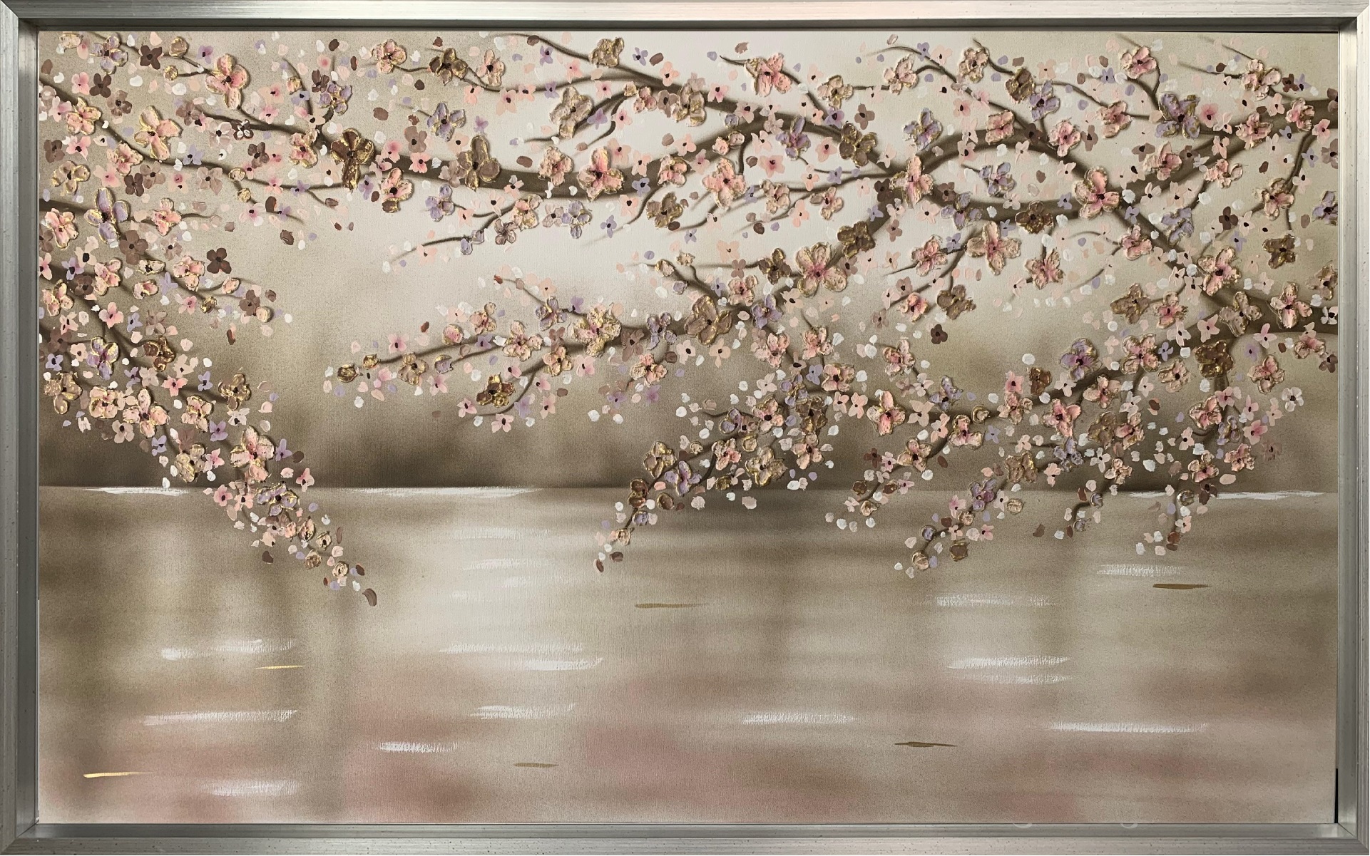 Quadro dipinto a mano “Fioritura Dell Anima”, 140x80cm, finitura tradizionale, cornice ad l in argento.