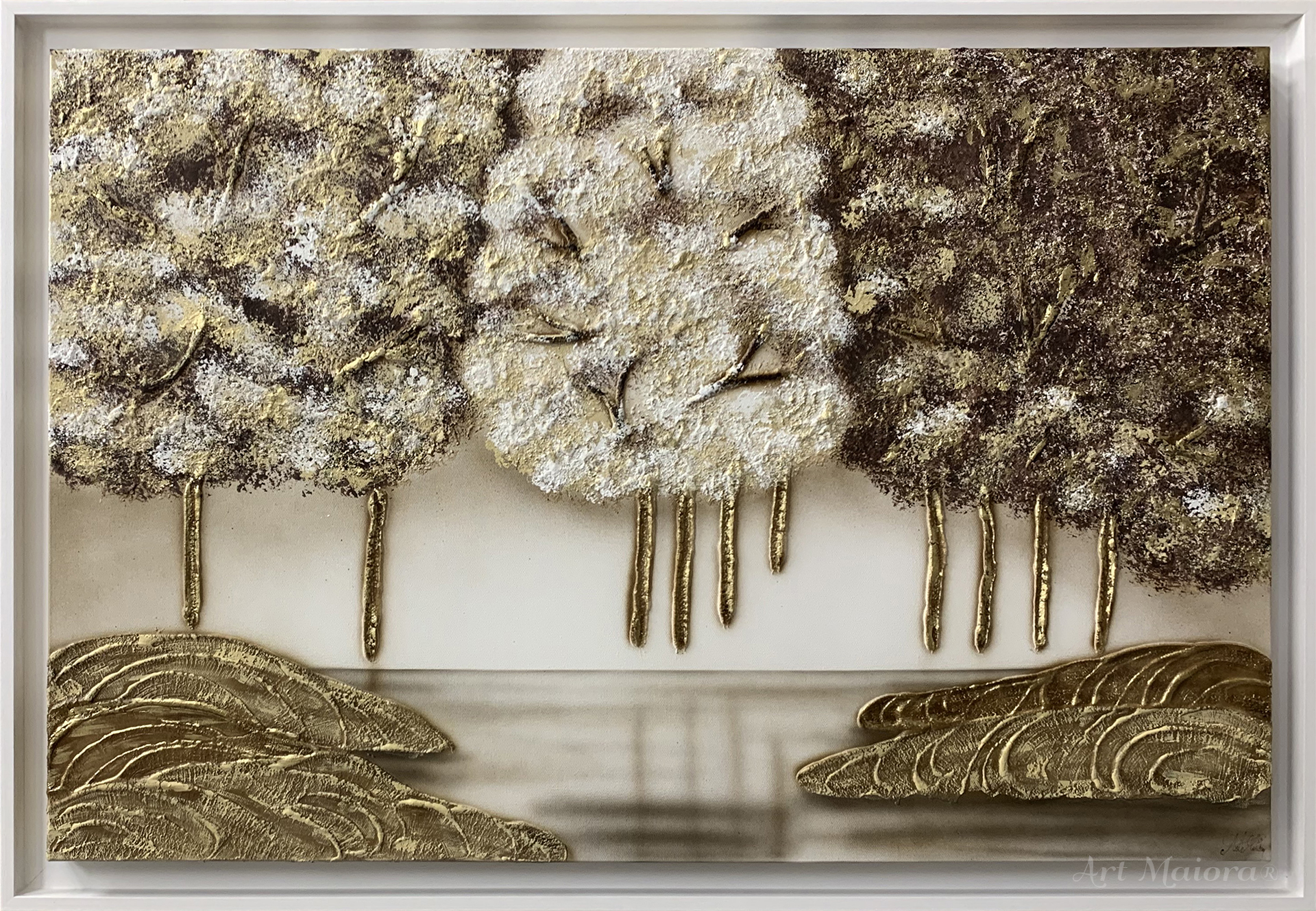 FORESTA ORO CON DIMENSIONE TELA DI 120 X 80 cm con FINITURA VARIANTE GOLD in abbinamento la CORNICE AD L BIANCA PORO APERTO. dipinto su tela realizzato a mano La dimensione finale del dipinto è 130 X 90 cm (larghezza x altezza)