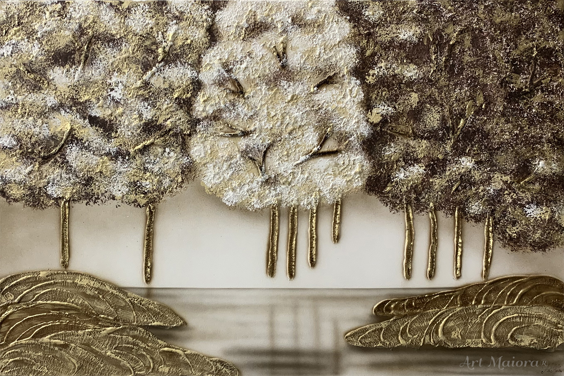 Quadro dipinto a mano “Foresta Oro”, 150x80cm, finitura gold, senza cornice.