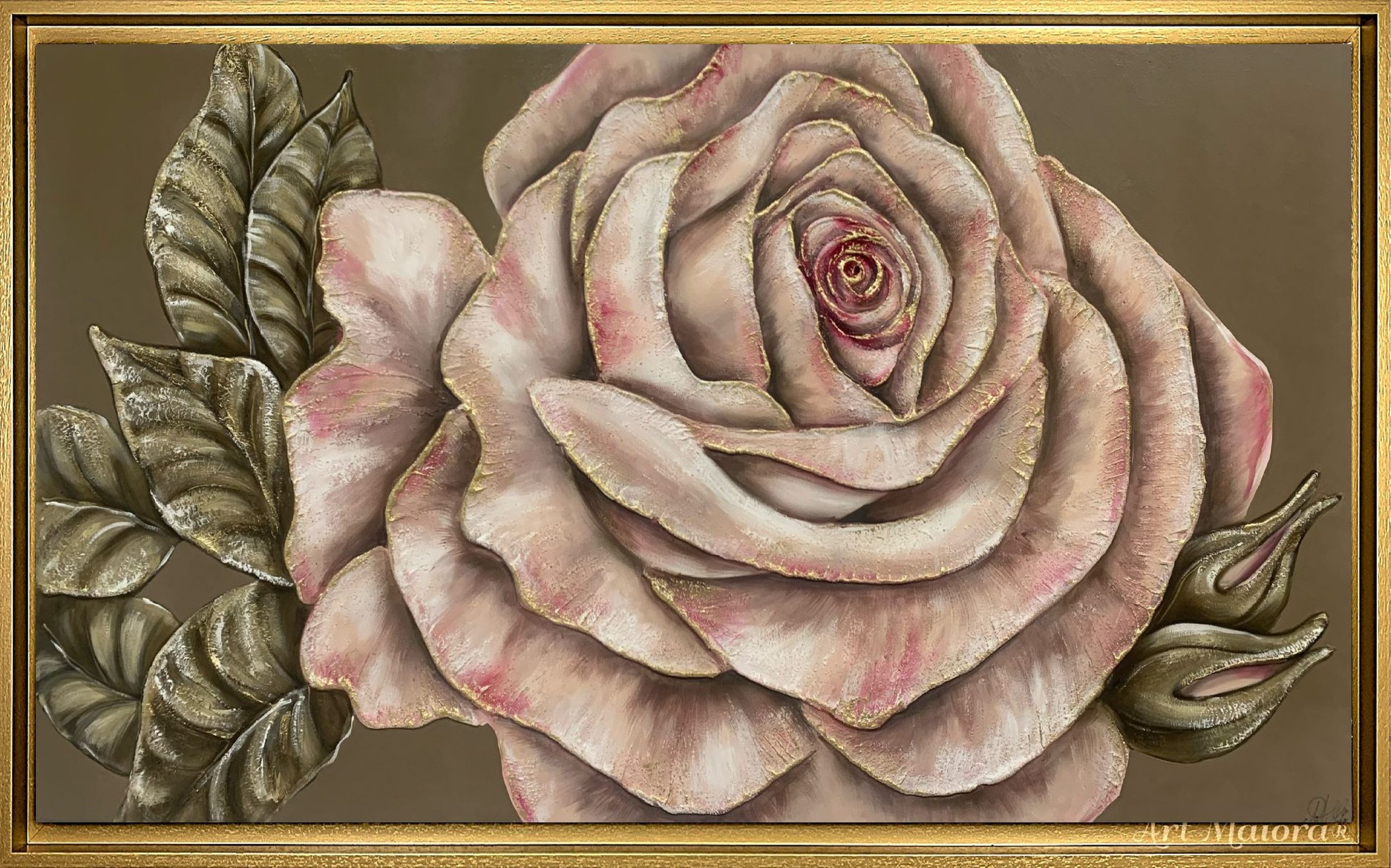 GELOSIA CON DIMENSIONE TELA DI 150 X 80 cm con FINITURA FONDO NOCCIOLA E ROSA MATERICA ROSA ANTICO in abbinamento la CORNICE AD L ORO VINTAGE. dipinto su tela realizzato a mano La dimensione finale del dipinto è 160 X 90 cm (larghezza x altezza)