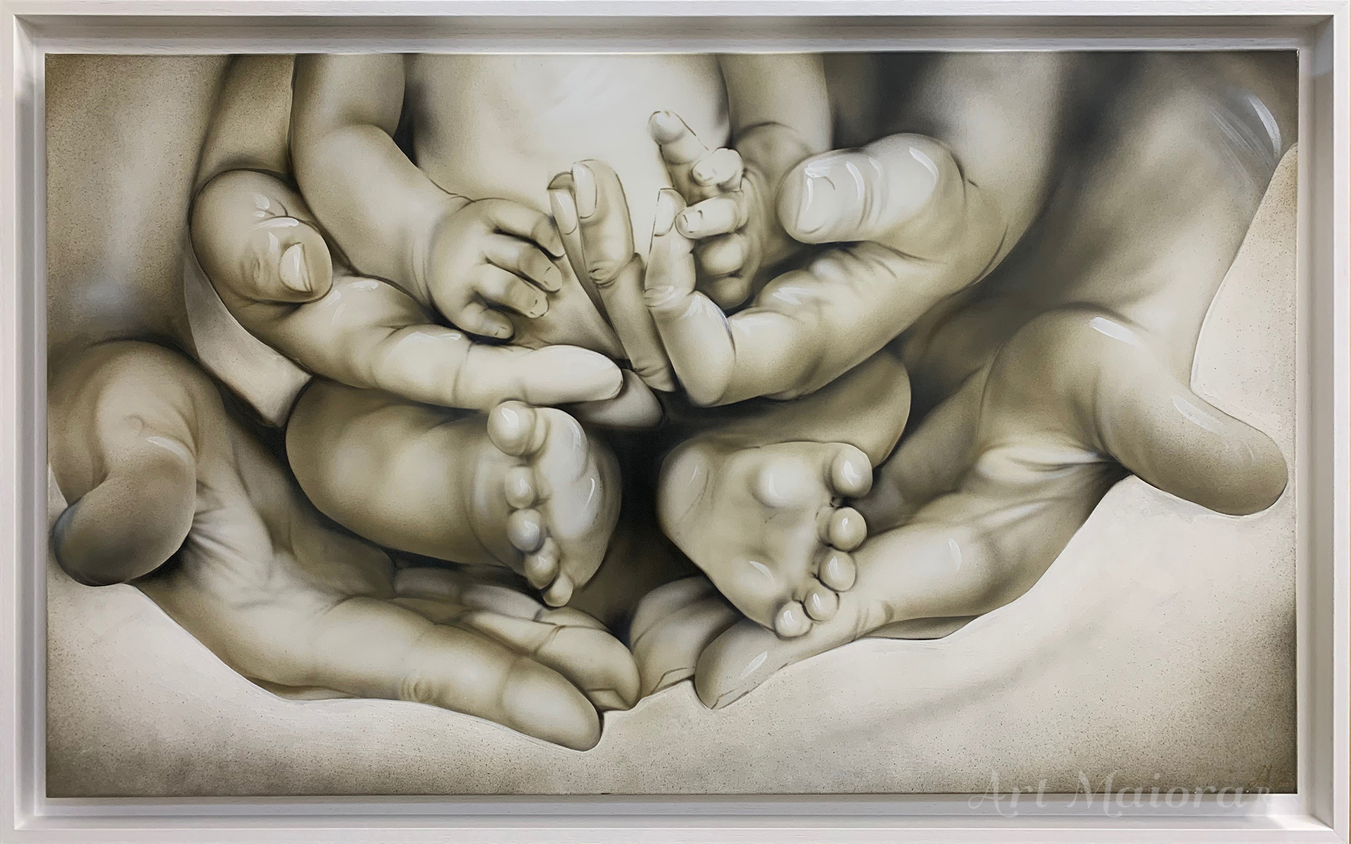 Quadro dipinto a mano “Infinito”, 120x75cm, finitura tortora e tortora caldo, cornice ad l bianca poro aperto.