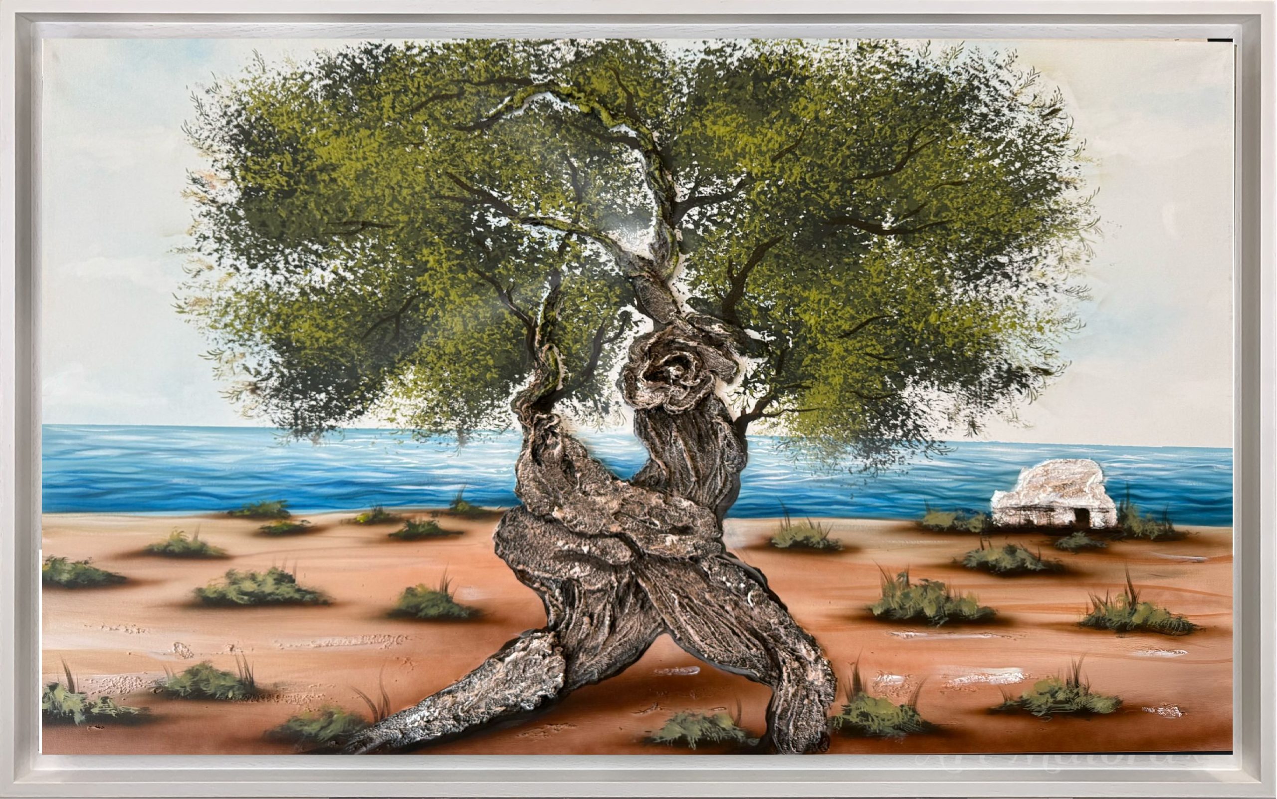 Quadro dipinto a mano “L Albero Del Mare”, 130x90cm, finitura tradizionale, cornice ad l bianca poro aperto.