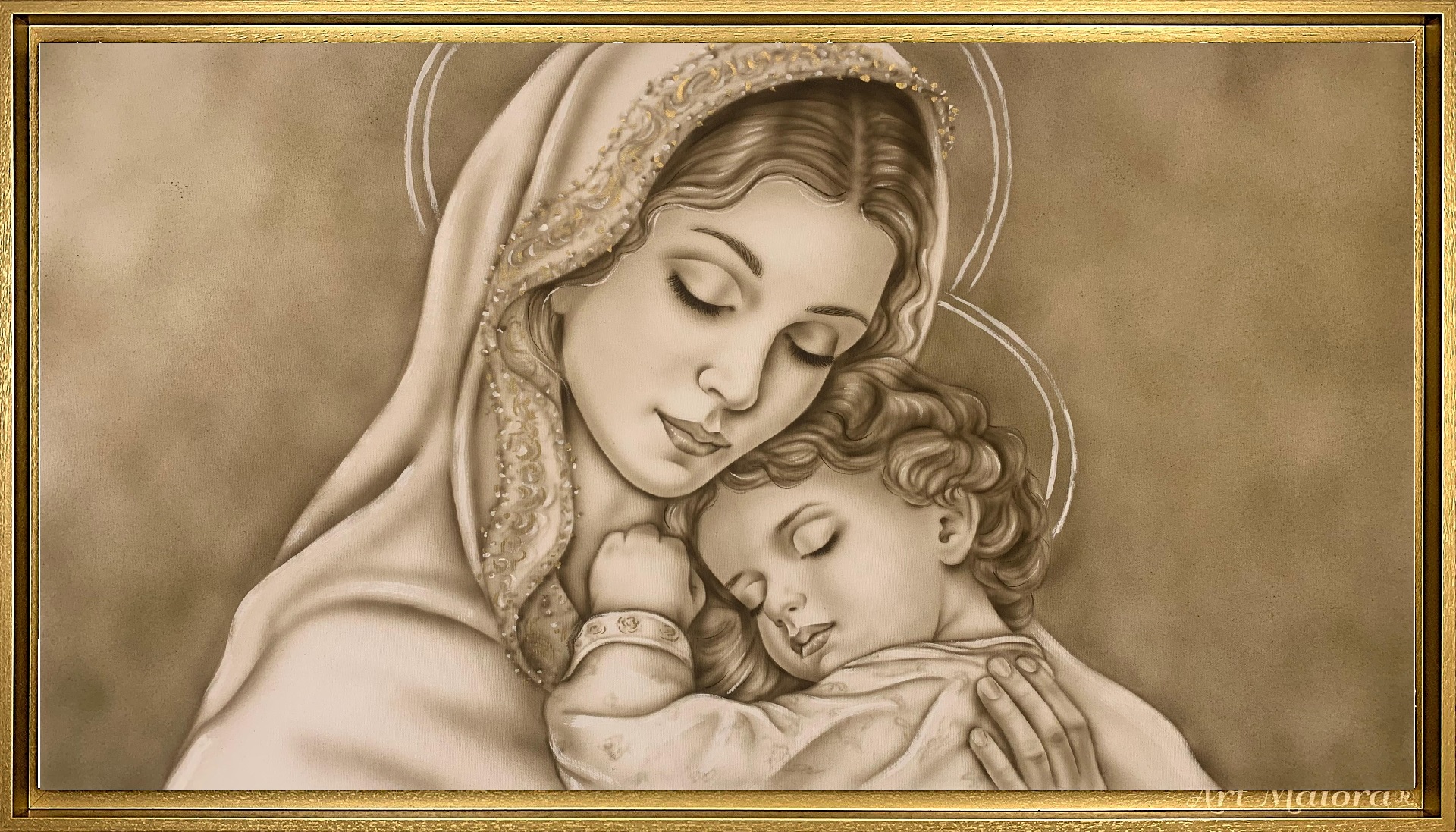 LUCE MATERNA CON DIMENSIONE TELA DI 110 X 65 cm con FINITURA VARIANTE TRADIZIONALE TC CON DECORO BIANCO E ORO in abbinamento la CORNICE AD L ORO VINTAGE. dipinto su tela realizzato a mano La dimensione finale del dipinto è 120 X 75 cm (larghezza x altezza)