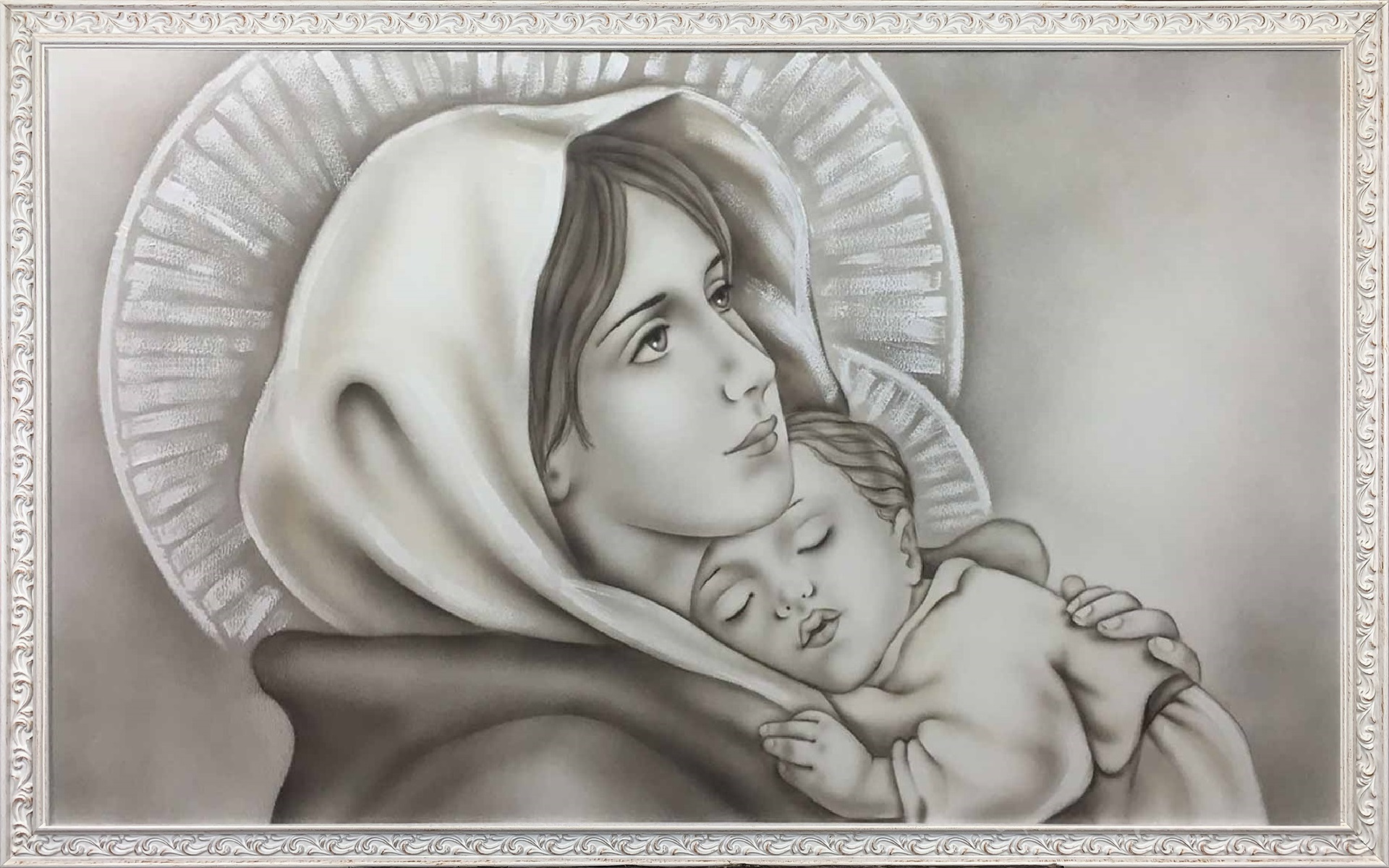 MADONNA DEL FERRUZZI CON DIMENSIONE TELA DI 110 X 65 cm con FINITURA VARIANTE GRIGIO in abbinamento la CORNICE DECAPE. dipinto su tela realizzato a mano La dimensione finale del dipinto è 120 X 75 cm (larghezza x altezza)