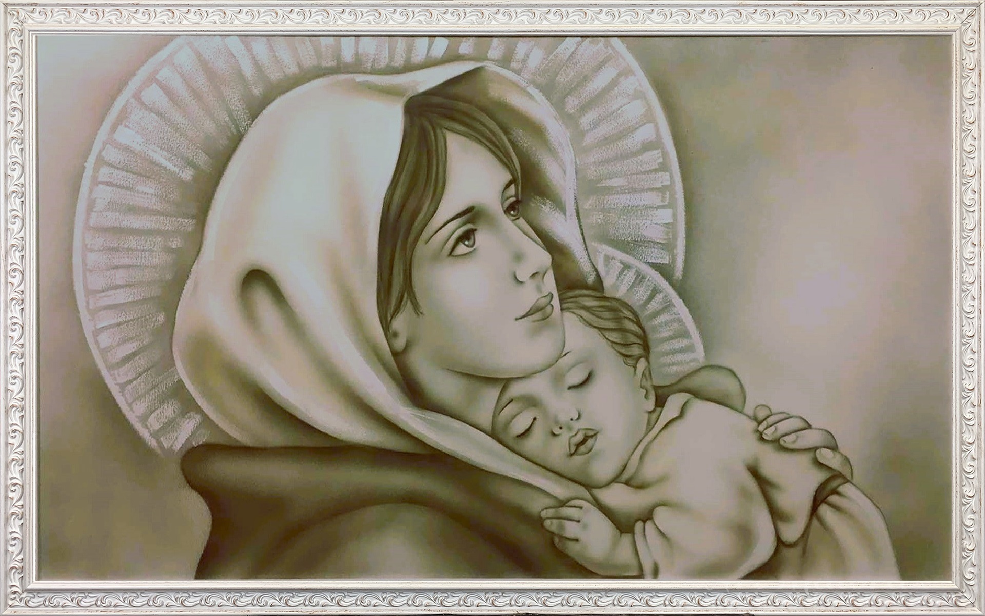 MADONNA DEL FERRUZZI CON DIMENSIONE TELA DI 110 X 65 cm con FINITURA VARIANTE TORTORA CALDO in abbinamento la CORNICE DECAPE. dipinto su tela realizzato a mano La dimensione finale del dipinto è 120 X 75 cm (larghezza x altezza)