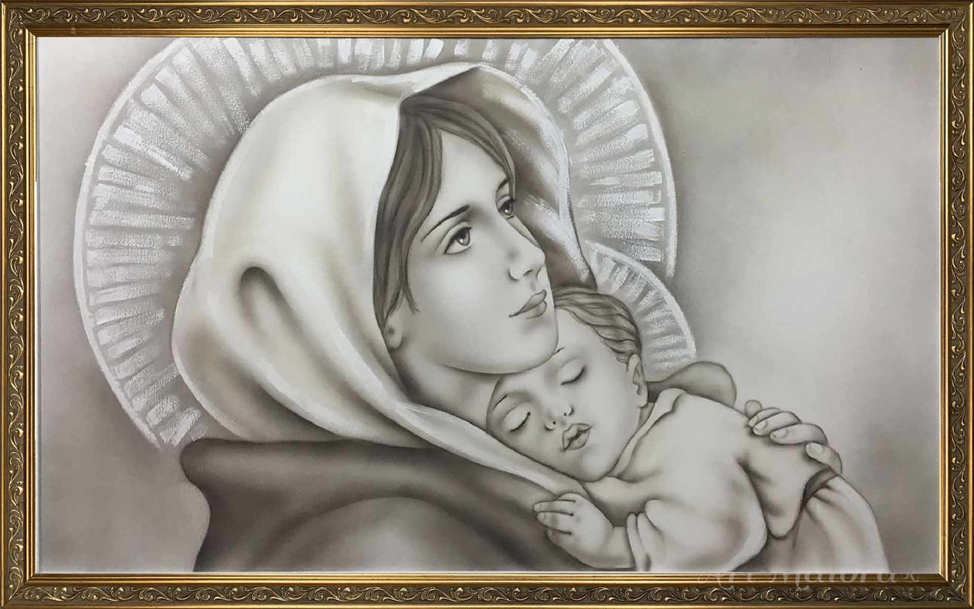 MADONNA DEL FERRUZZI CON DIMENSIONE TELA DI 110 X 65 cm con FINITURA VARIANTE GRIGIO in abbinamento la CORNICE DECAPE ORO. dipinto su tela realizzato a mano La dimensione finale del dipinto è 120 X 75 cm (larghezza x altezza)