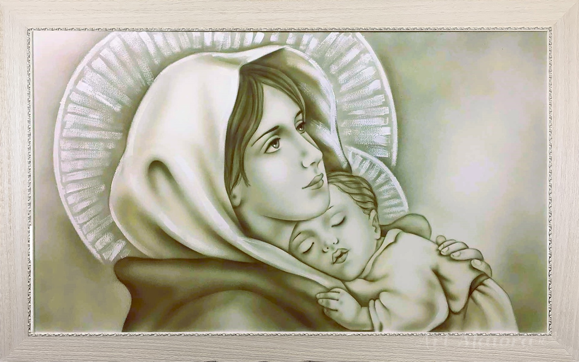 MADONNA DEL FERRUZZI CON DIMENSIONE TELA DI 110 X 65 cm con FINITURA VARIANTE TORTORA in abbinamento la CORNICE CONTEMPORANEA ARGENTO. dipinto su tela realizzato a mano La dimensione finale del dipinto è 120 X 75 cm (larghezza x altezza)