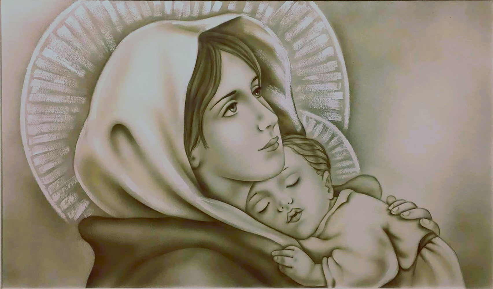 MADONNA DEL FERRUZZI CON DIMENSIONE TELA DI 110 X 65 cm con FINITURA VARIANTE TORTORA CALDO Senza Cornice. dipinto su tela realizzato a mano