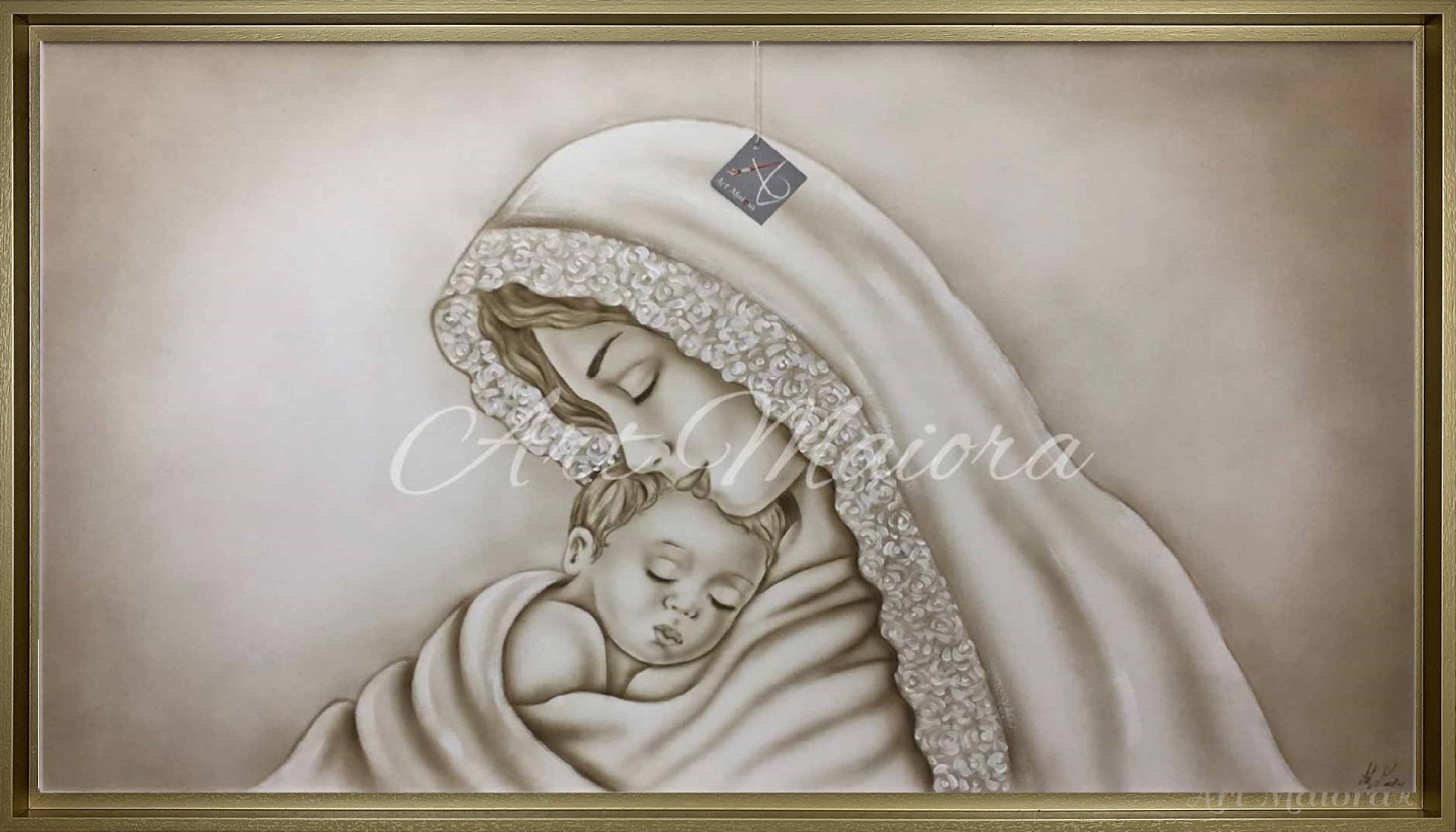 MARIA CON DIMENSIONE TELA DI 110 X 65 cm con FINITURA VARIANTE TORTORA CALDO in abbinamento la CORNICE AD L ORO VINTAGE. dipinto su tela realizzato a mano La dimensione finale del dipinto è 120 X 75 cm (larghezza x altezza)