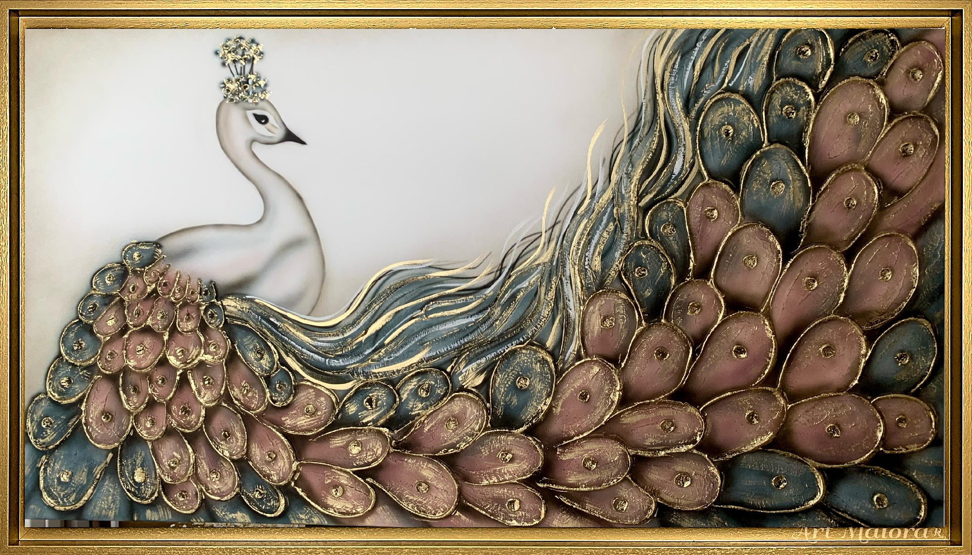 NARCISO CON DIMENSIONE TELA DI 130 X 70 cm con NRS – VARIANTE POLVERE CELESTE E BIANCO in abbinamento la CORNICE AD L ORO VINTAGE. dipinto su tela realizzato a mano La dimensione finale del dipinto è 140 X 80 cm (larghezza x altezza)